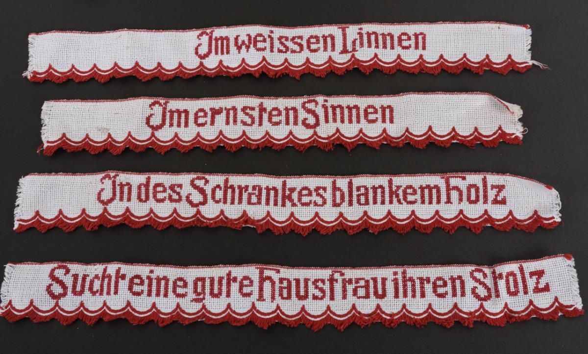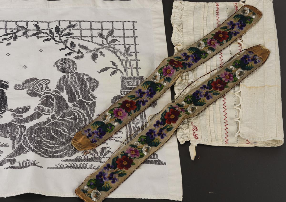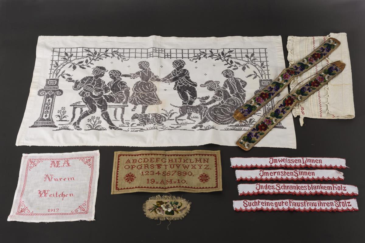 Ziertuch mit 6 tanzenden Figuren 57 x 104 cm. 2 Stickmuster- und ein Nähmustertuch. 2 mit Blumen und Perlstickerei verzierte (Hosenträger?)-Bänder L 60 cm. Vierteiliger Schrankspruch L max. 42 cm. Kleiner Stickeinsatz mit Blumen. Alters-/Gebrauchsspuren.