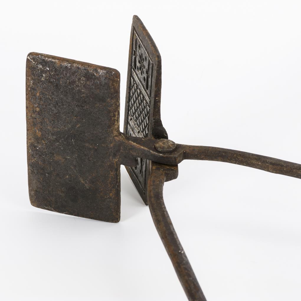 Großes "Waffeleisen" in rechteckiger Form. Beidseitig innen stilisiert florale Negativ-Motive: Herz, Vögel, Pferde und Blumen sowie Waffelmuster. Kaum Alters-/Gebrauchsspuren.