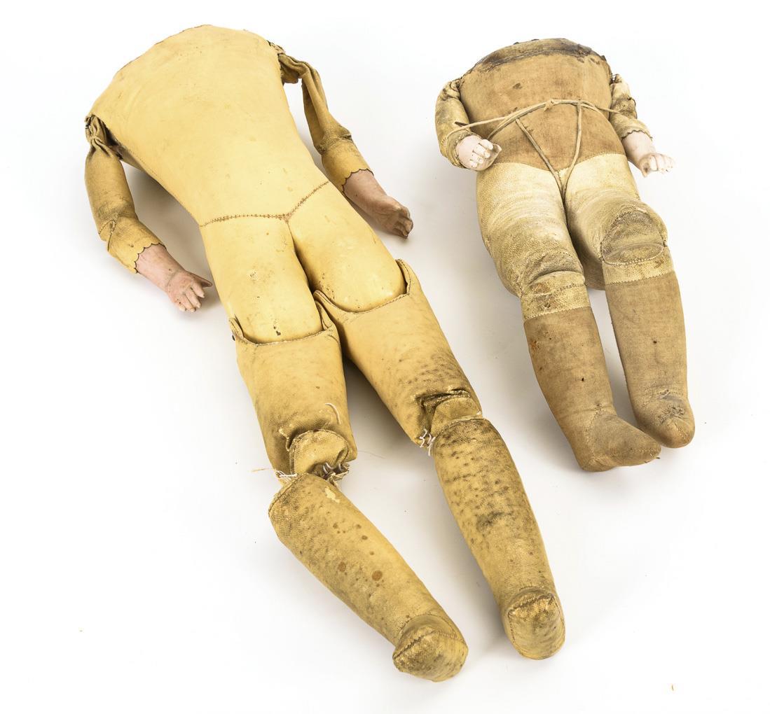 Ersatzteile für Brustkopfpuppen, darunter 3 Körper mit Defekten, davon einer mit ergänzten Armen. Über 30 Unterarme (meist Biskuit), Spanngummi, Kasten voller Massehände (unbemalte Rohlinge, stark verschmutzt), 6 geklammerte Augenpaare, zahlreiche Celluloidzungen.
