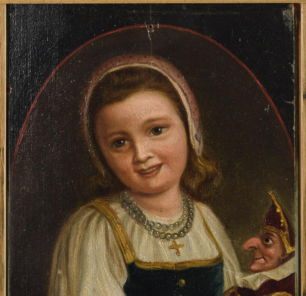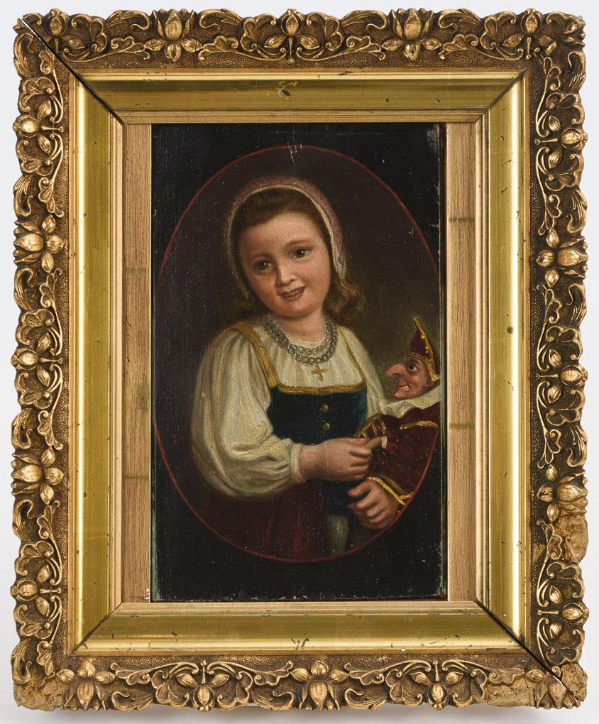 Lächelndes Mädchen mit Kasper-Handspielpuppe im Arm. Etwas restaurierungsbedürftig.