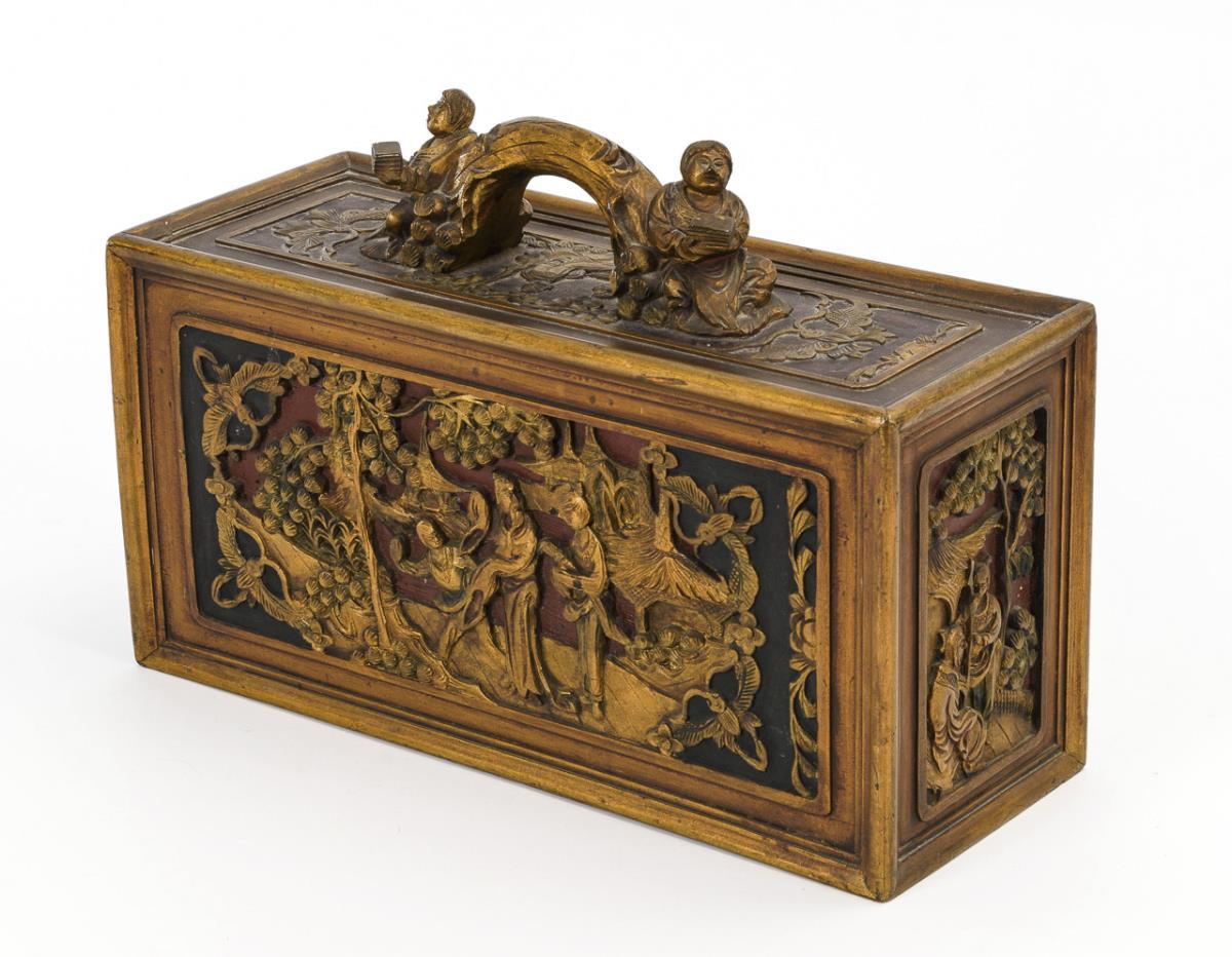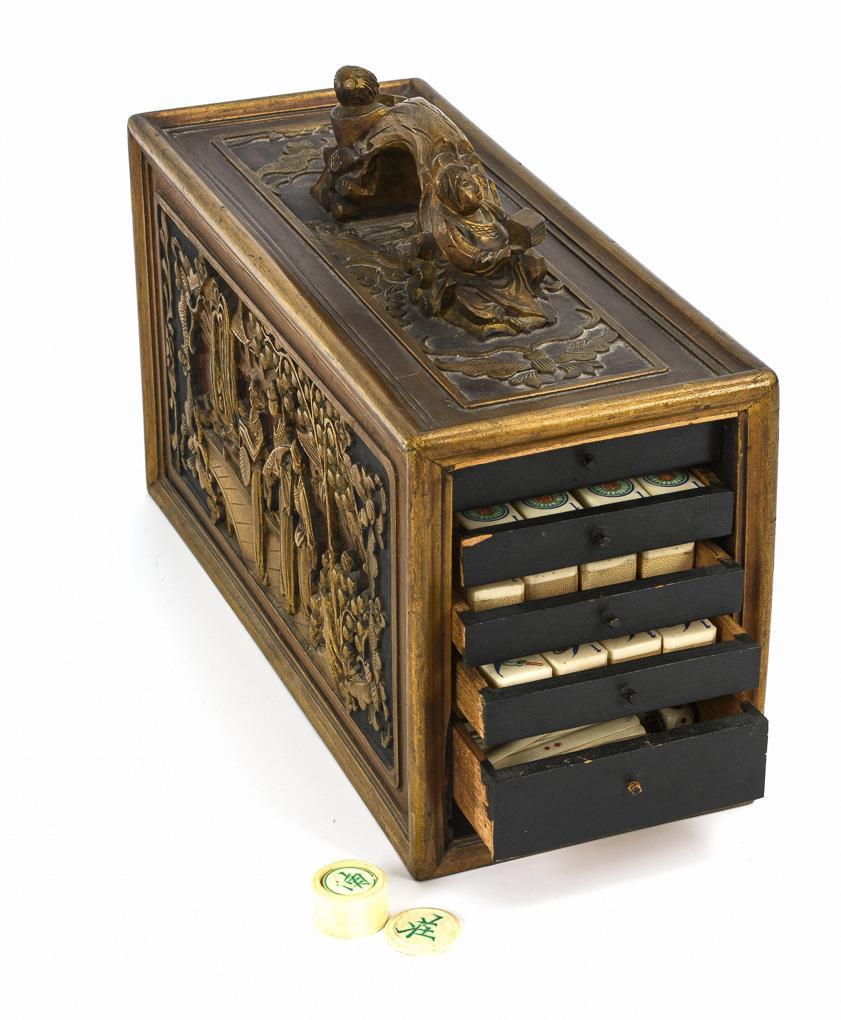 Holzkasten mit goldfarbenen Reliefschnitzereien. An der Schmalseite zu öffnen, dahinter 5 Schübe mit den Spielsteinen und Zahlstäbchen sowie zwei Würfeln und einem Döschen mit Schriftzeichen-Spielmarken. Leichte Gebrauchsspuren, ein Schub klemmt. Jünger kopierte Spielanleitung liegt bei.