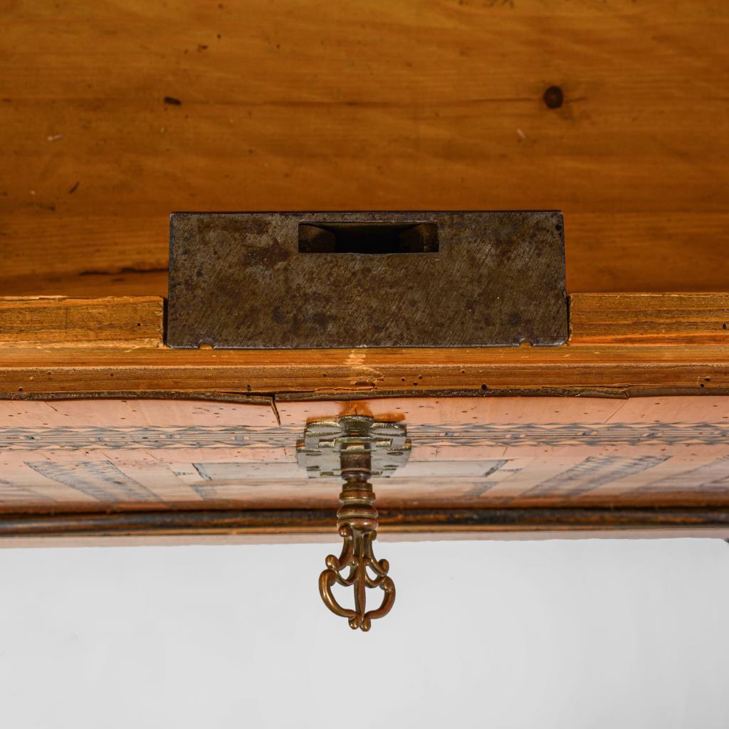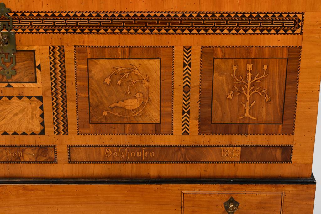 Hochzeits-Kastentruhe mit Klappdeckel und aufwändiger Marketerie aus geometrischen Bändern, Bäumen und Finken, bezeichnet "Luise Heppler von Holzhausen 1892", 2 kleine Schübe im Sockel; innen mit Beifach. Furnier mit stärkeren Gebrauchsspuren.