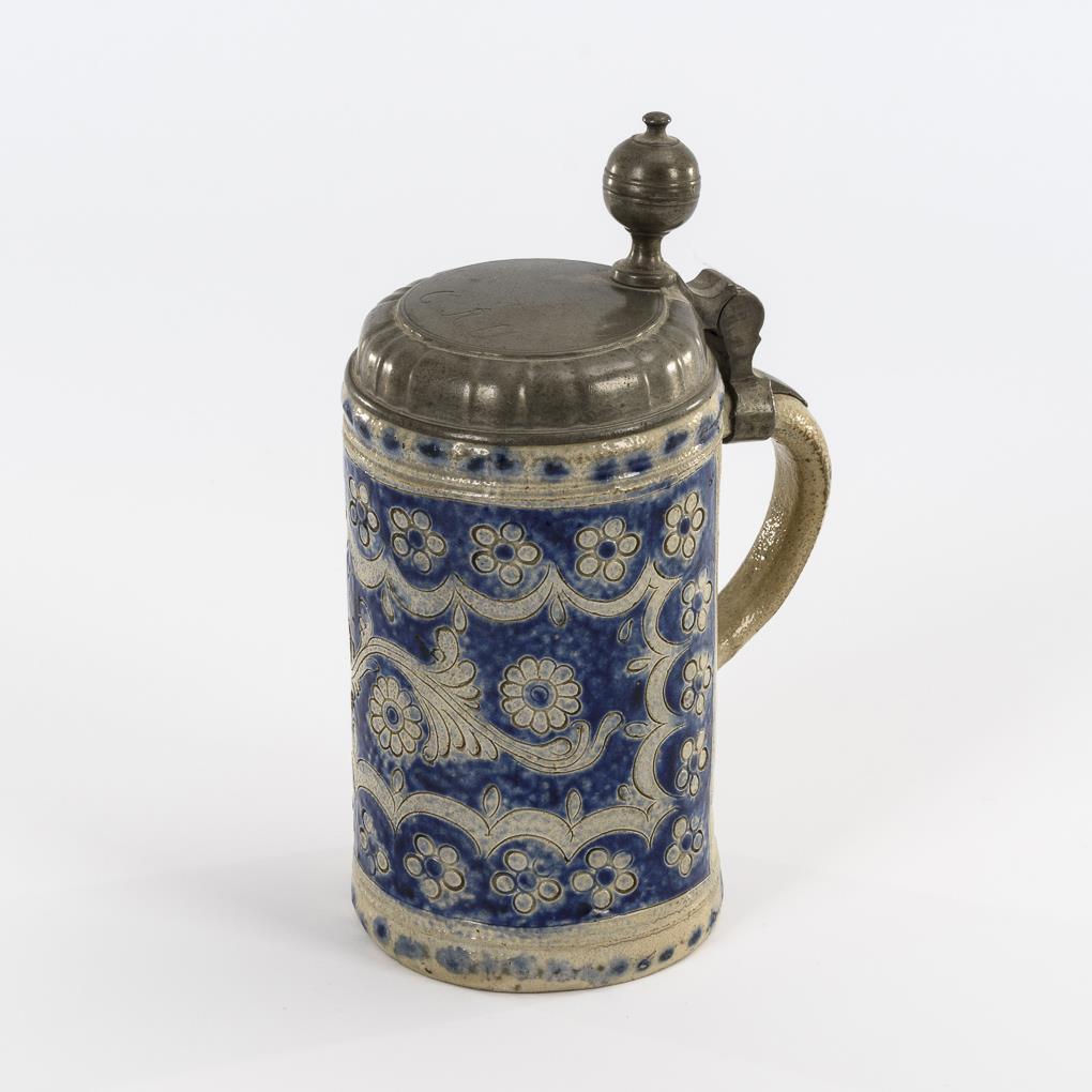 Zylinderkrug mit Ohrenhenkel. Schauseitig Stempelblüten. "C.R.U." gravierter Zinndeckel mit Kugeldrücker. Leicht brandrissig, Glasurbereibungen.