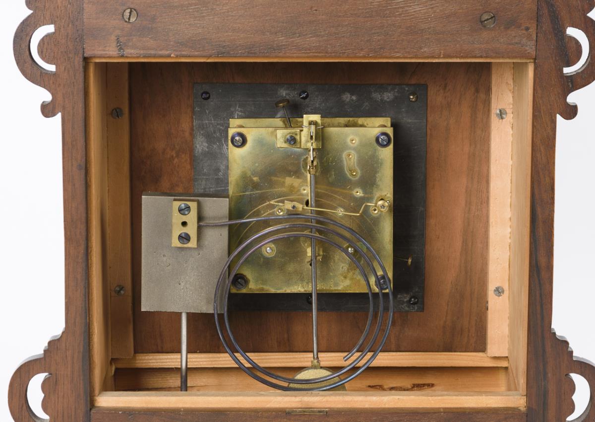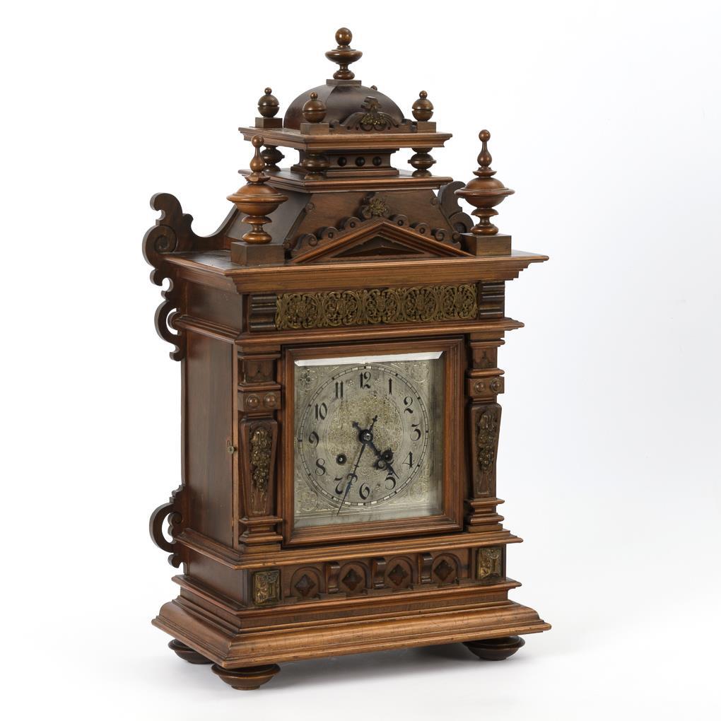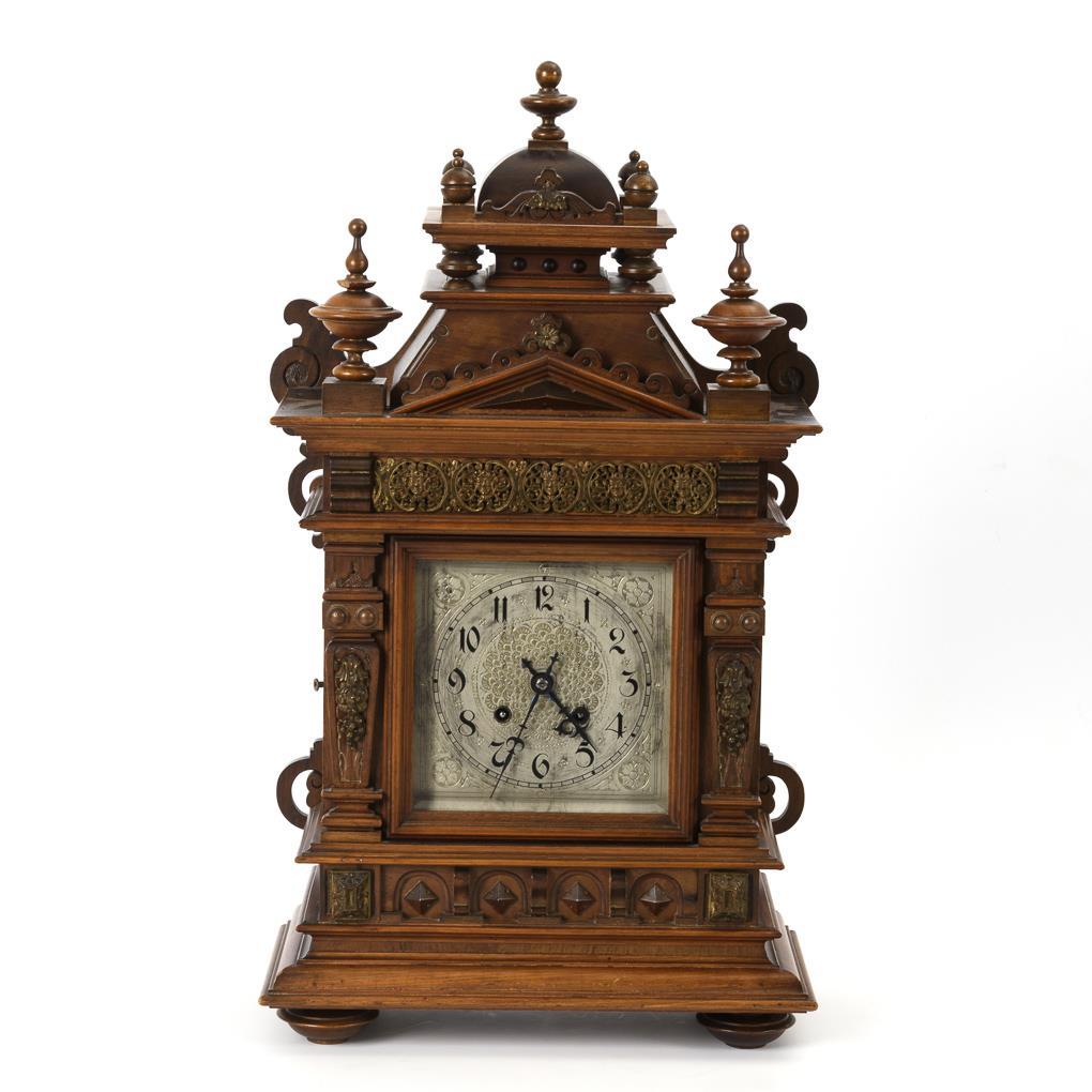 Architektonisches Gehäuse mit historistischem Schnitz- und Drechseldekor sowie dekorativen Messingapplikationen. Zifferblatt berieben.