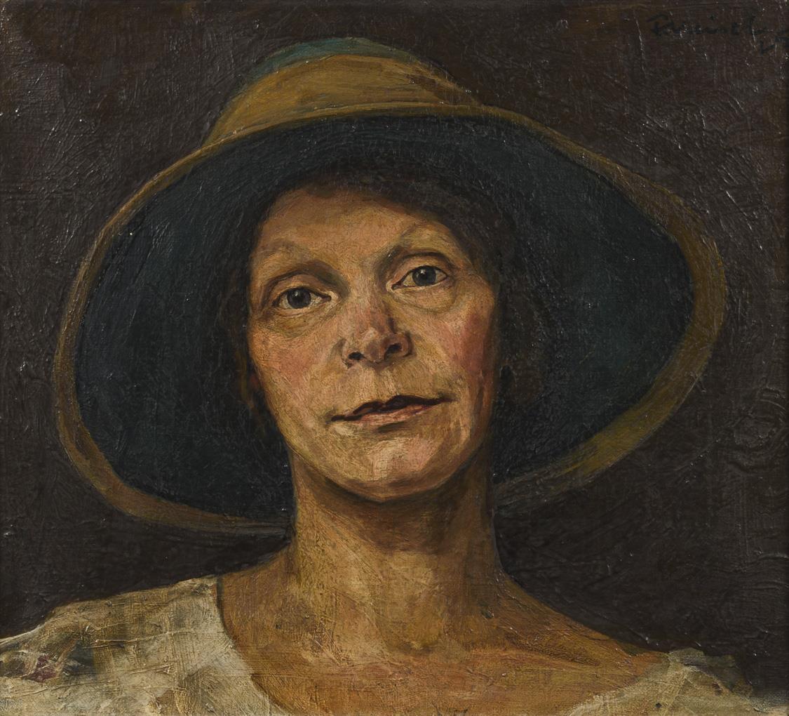 Frontales Bildnis einer Frau mit Sommerhut. Reinigungsbedürftig.