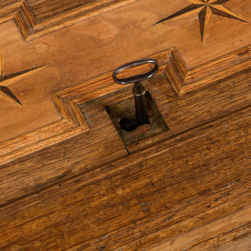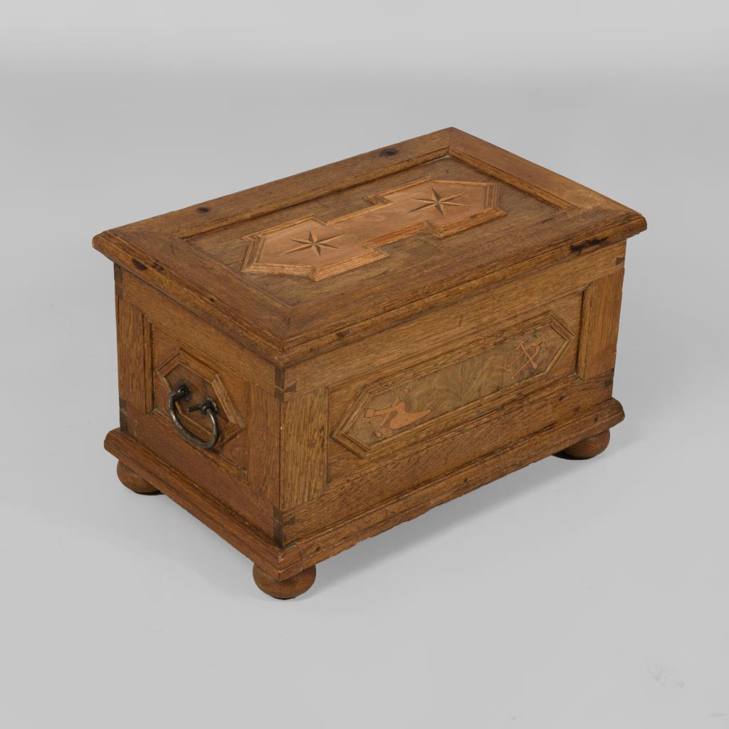 Kleine kastenförmige Lade mit seitlichen Bügelgriffen und kassettierten Feldern, intarsiert mit Zunftzeichen der Zimmerer, Datum und Sternen; innen mit kleinem Beifach. Restauriert, Schloss ergänzt.