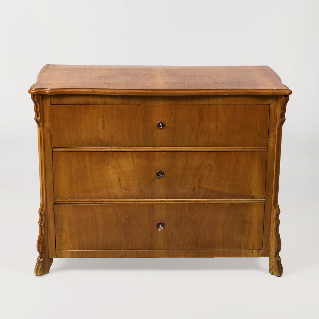 3-schübige Kommode mit leicht geschwungener Deckplatte und profilierten Seitenleisten. Alters-/Gebrauchsspuren, Deckplatte mit Bruchkante und sichtbarer Retusche, alt restauriert.