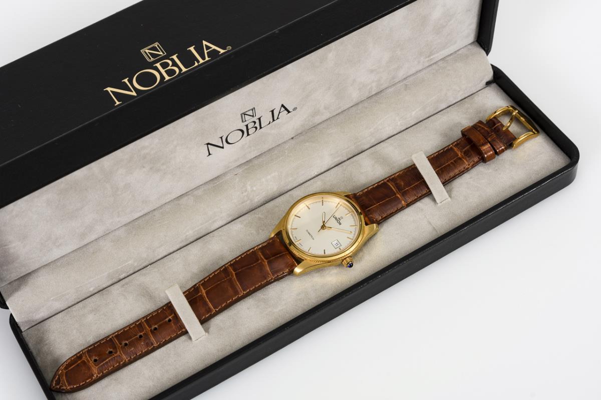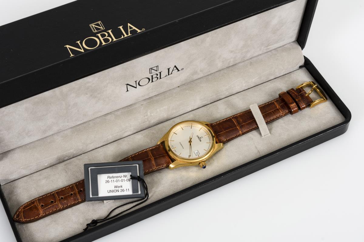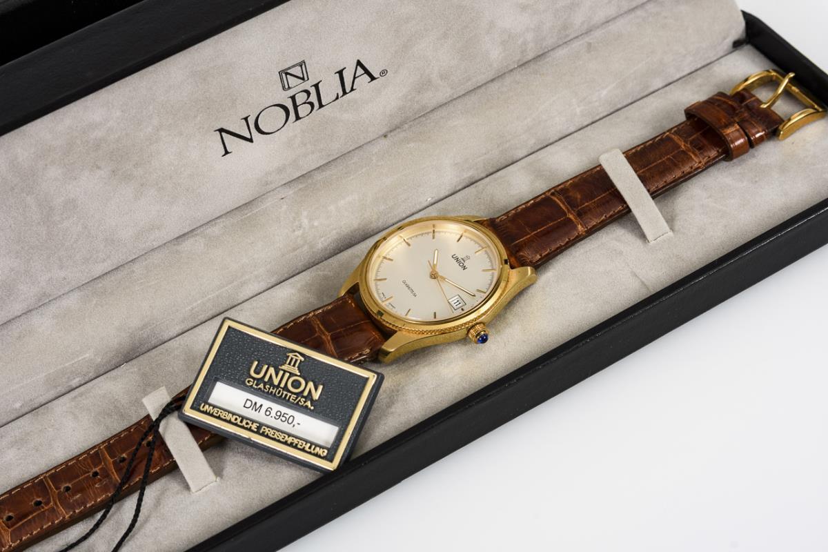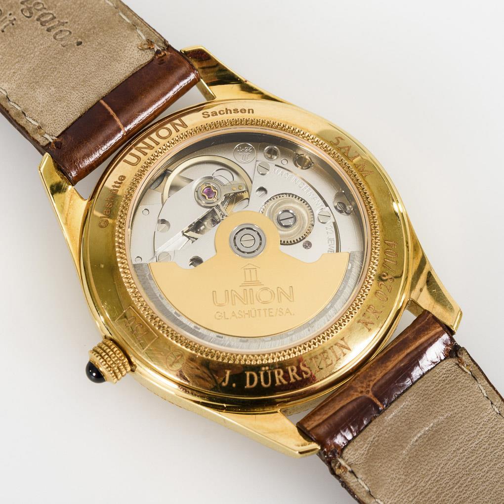 Goldene Automatik-Herrenarmbanduhr in Etui. UNION GLASHÜTTE Sachsen, J. Dürrstein.