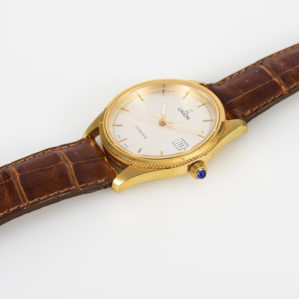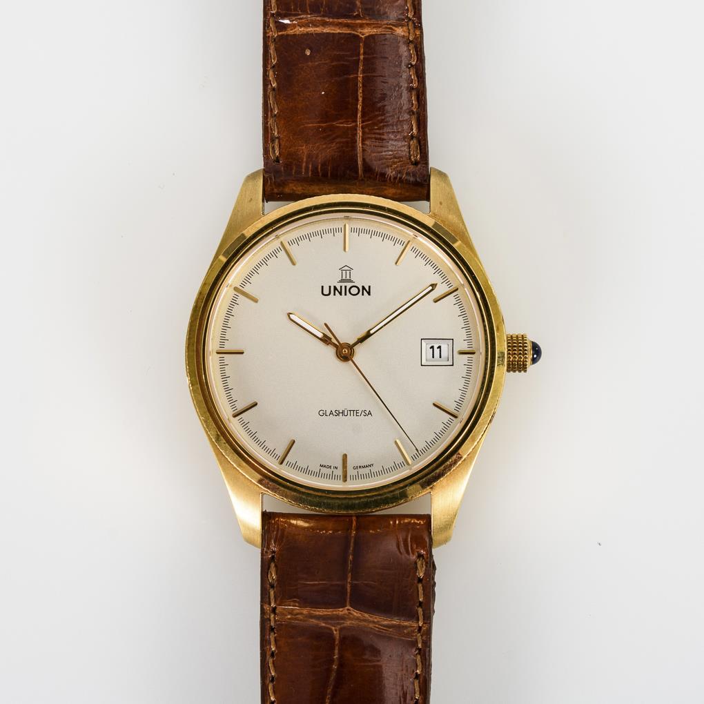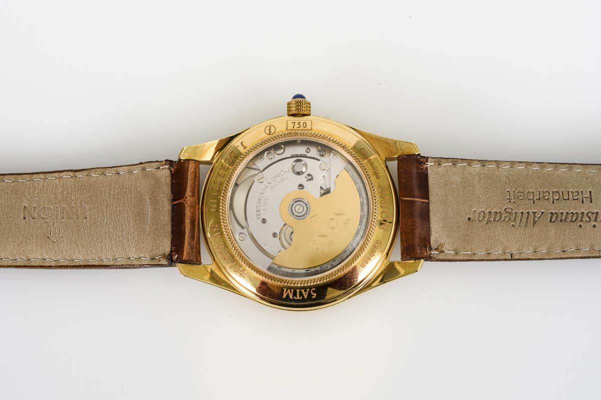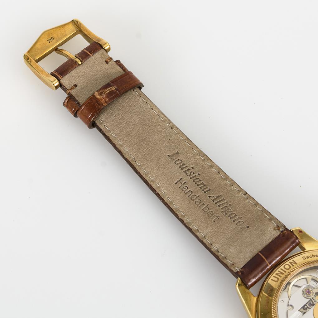 Automatikwerk, goldene Stellkrone mit Saphircabochon. Läuft. Herstellerprägung Werk: Uhrenfabrik Union Glashütte/Sachsen. Silberfarbenes Zifferblatt mit Indizes, Minuterie mit 1/5-Sekunde, Zentralsekunde und fluoreszierenden Stabzeigern, Datumsanzeige mit Schnellschaltung. Herstellerprägung Anzeige: "Union, Glashütte/Sa".
