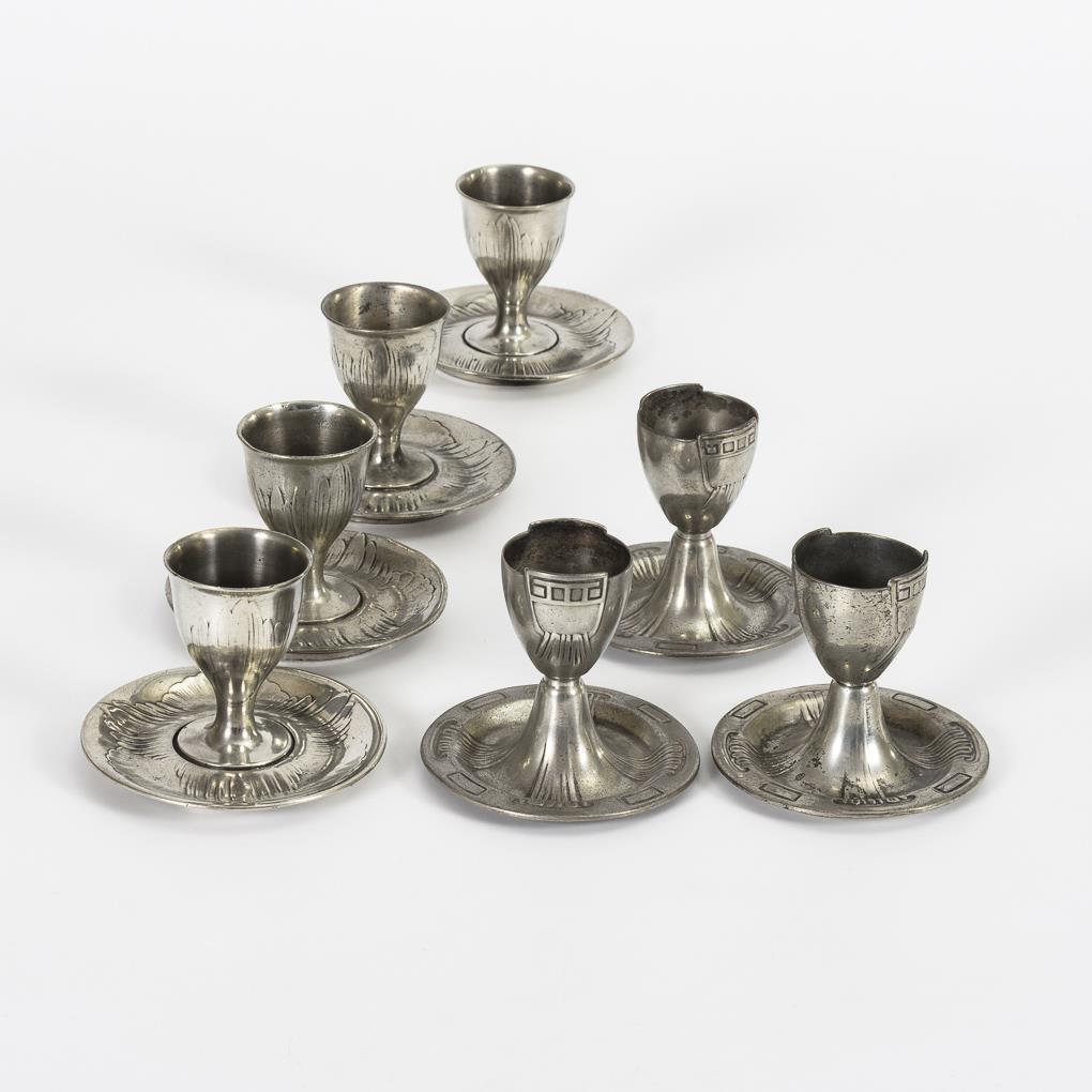 7 Eierbecher Jugendstil-Zinn. 4x Kayserzinn, 3x Holland Urania.