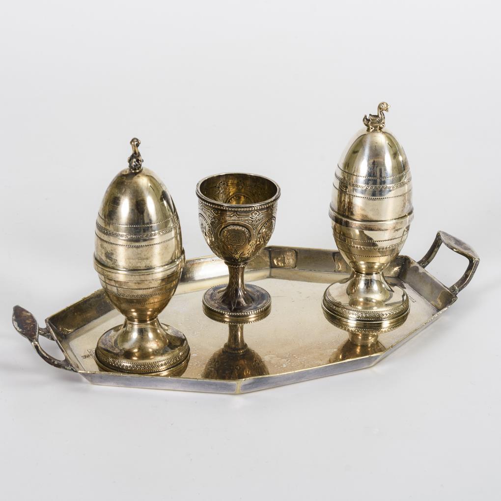 Sterlingsilber, Messing versilbert. H maximal 12 cm, Tablett 27 x 15 cm. Eierbecher 188 g.