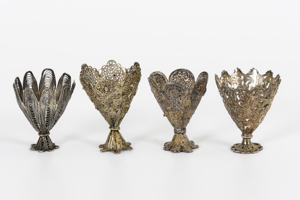 4x Silberfiligan, sonst verschiedene Formen, teils mit Fußschale, teils mit Scharnierdeckel. 1 Silberbecher mit Gravur "Hans Heinrich". Dazu ein Lacklöffel. Teils Alters-/Gebrauchsspuren.