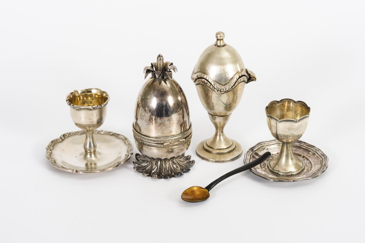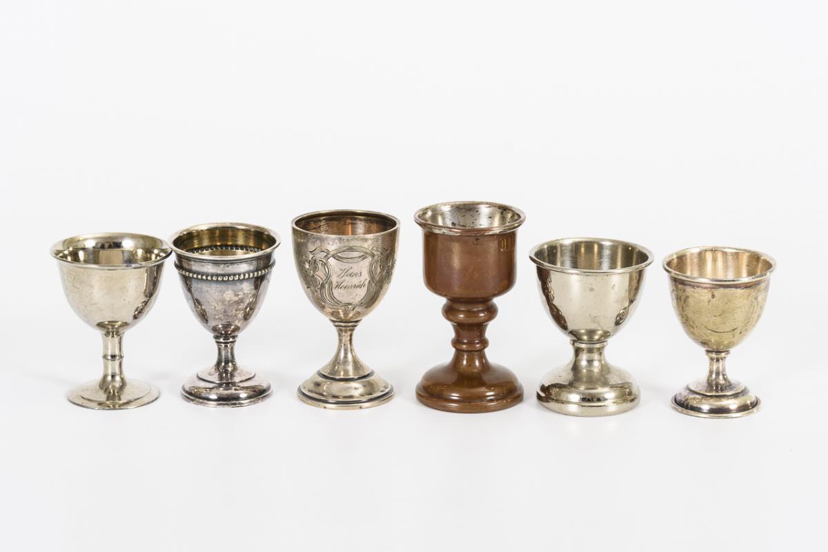 Konvolut 14 Eierbecher + 1 Lacklöffel. 1x WMF, 1x Gebrüder Bing.