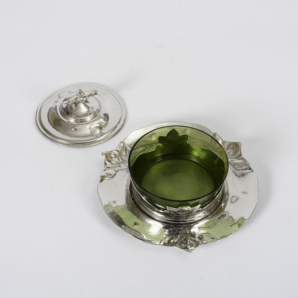 Teller und Passdeckel mit stilisierten Blättern, originaler grüner Glaseinsatz. Wenige Alters-/Gebrauchsspuren.