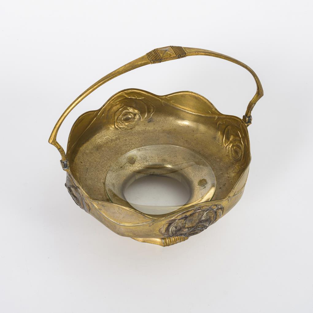 Gefußte Schale mit Rosenrelief und scharniertem Henkel. Etwas berieben, Glaseinsatz ergänzt.