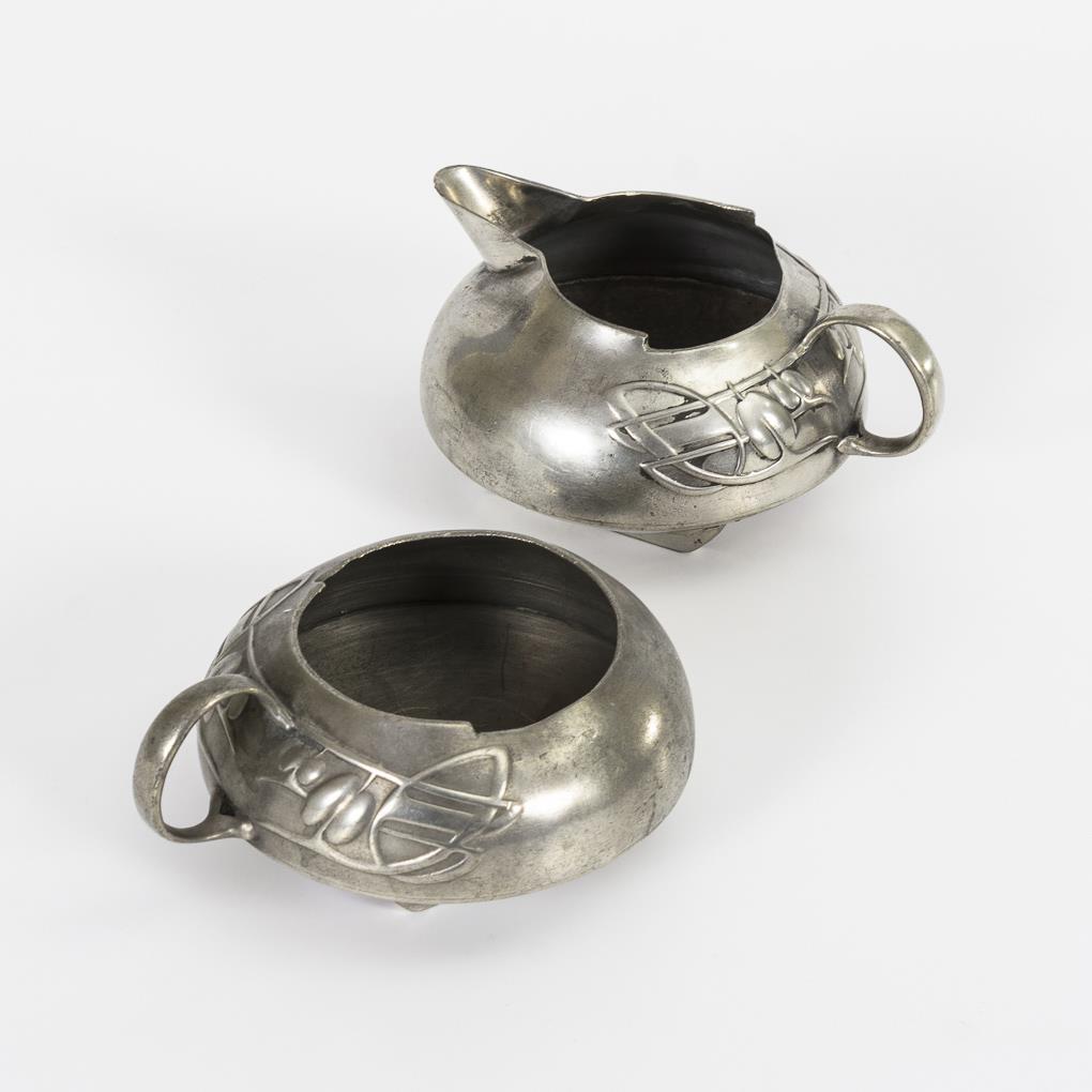 2 gleiche Henkeltabletts sowie Sahnegießer und Zuckerschale; je mit stilisiertem Relief. Alters-/Gebrauchsspuren.