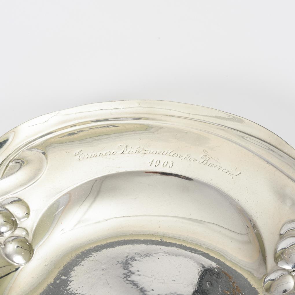 Längliches WMF-Tablett und -Sahnegießer. Dazu annähernd runde Schale mit gravierter Widmung von 1903. Einige Alters-/Gebrauchsspuren.