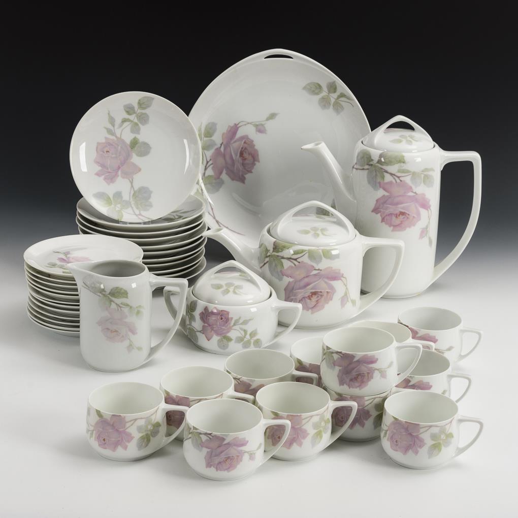 40 Teile. Formentwurf von Günther Reinstein (1880-1938?) und Philipp Rosenthal (1855-1937), 1904. Kaffeekanne (H 24 cm), Teekanne, Milchkännchen, Zuckerdose, 12 Tassen, 12 Untertassen, 11 Kuchenteller und 1 Kredenzteller. Einige Kuchenteller mit Gebrauchsspuren.