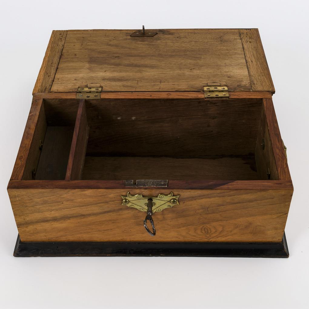 Eichen-Blindholz, Nussbaum furniert, teils ebonisiert, Messing-Beschläge. 16 x 41 x 24 cm.