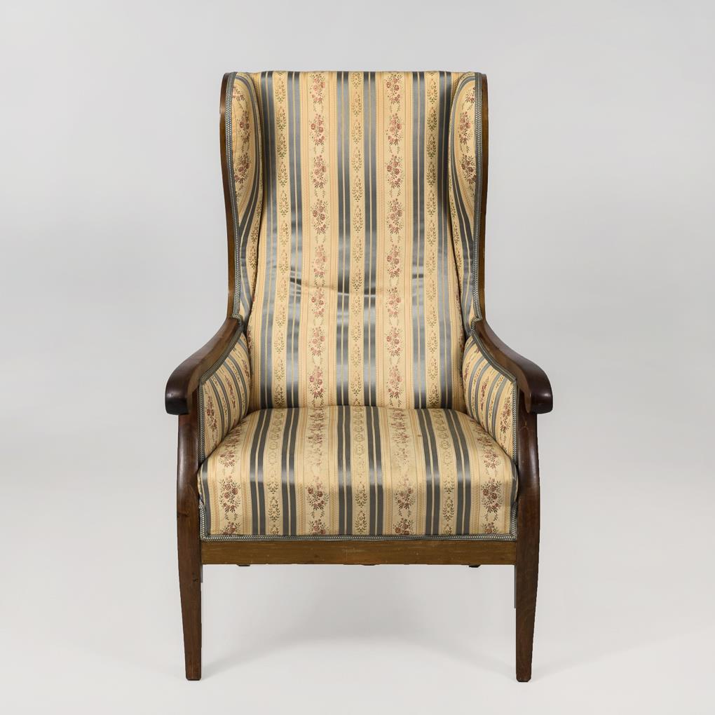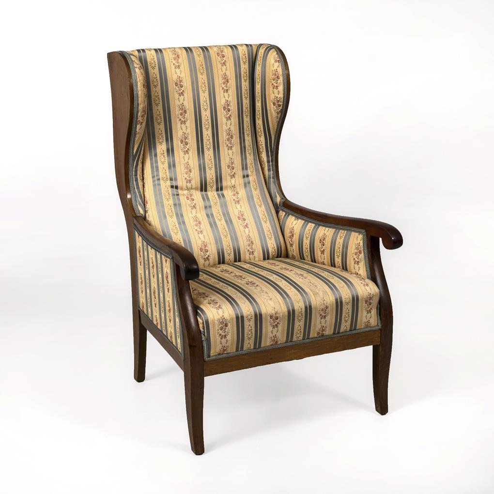 Schlichter Sessel mit hoher Rückenlehne, gepolsterten Ohrenbacken und volutierten Armlehnen, hell-gestreifter Bezug mit Blumenrapport. Alters-/Gebrauchsspuren, alt restauriert, Polster und Bezug ergänzt.