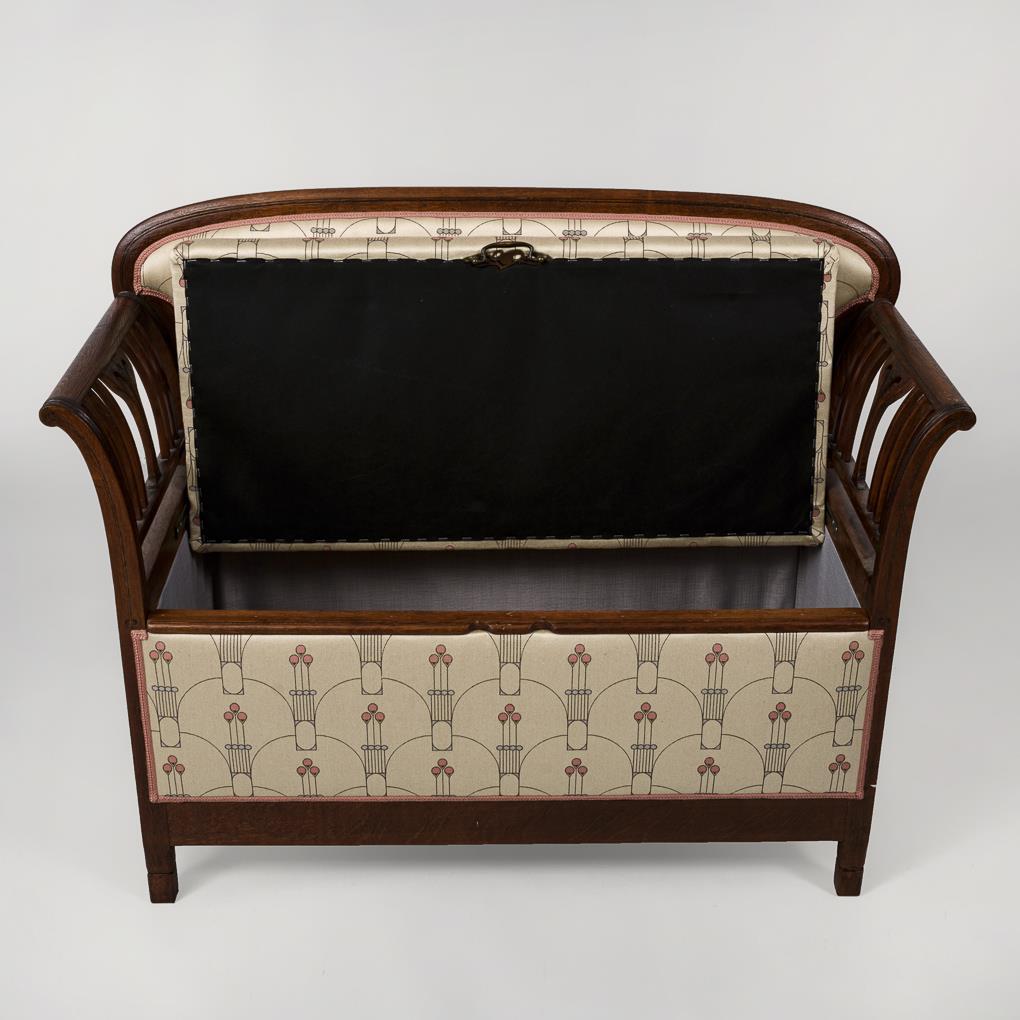 Stiltypische Bank mit durchbrochen gearbeiteten Lehnenteilen und Sitzfläche mit unterbautem Aufbewahrungsteil; heller Bezug mit Jugendstil-Ornamentik . Wohnfertig restauriert, Polster und Bezug passend ergänzt.