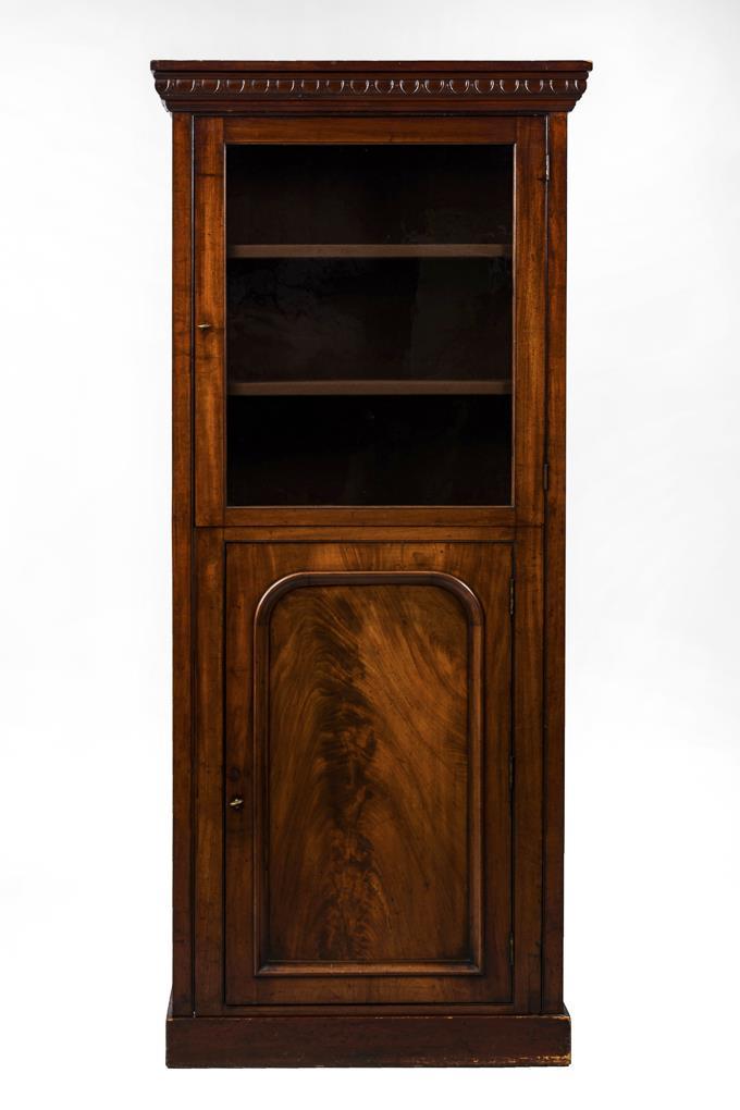 Schlichter Bücherschrank mit Vitrinenoberteil und 1-türigem Unterteil; Gesims verziert mit reliefiertem Kymation; Oberteil mit 2 Einlegeböden, Unterteil mit 1 Einlegeboden. Alters-/Gebrauchsspuren, kleine Bestoßungen, Schlüsselbeschläge fehlen.
