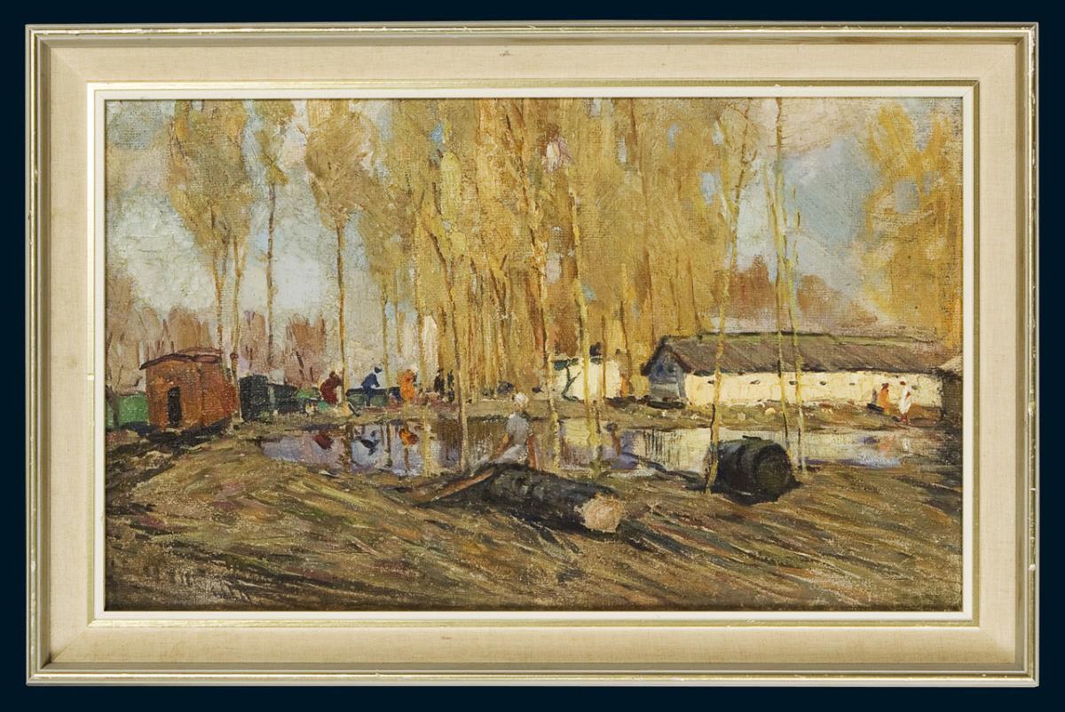 Szene aus dem russischen Arbeitsalltag im Stil des sozialistischen Realismus. Rückseitig verwaschener russischer Zollstempel. Profilierter Rahmen mit Leinenbezug.