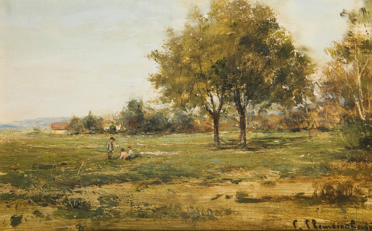Impressionistisch angelegte weite Sommerlandschaft mit Figurenstaffage. Vergoldeter Stuckrahmen.