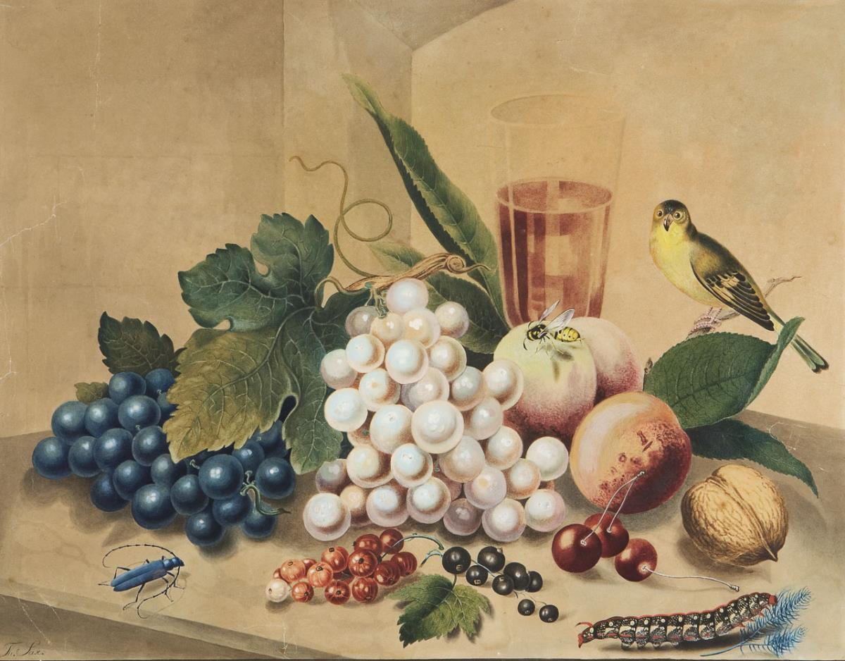 Die Früchte und Tiere wirken nicht arrangiert, sondern entwickeln einzeln für sich eine eigenständige Präsenz. Verglaster Goldrahmen. Partiell Risse, Knicke.
