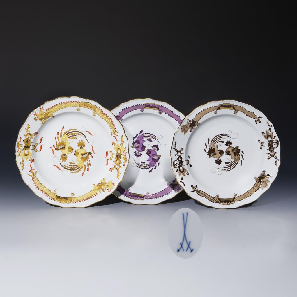 Camaieu-Malerei in Gelb, Violett und Braun, gold schattiert. Ein Teller gold und korallenrot schattiert. "Drachendekor", gold staffierte Ränder. Form "Neuer Ausschnitt". Pressmarken, Schwertermarken.