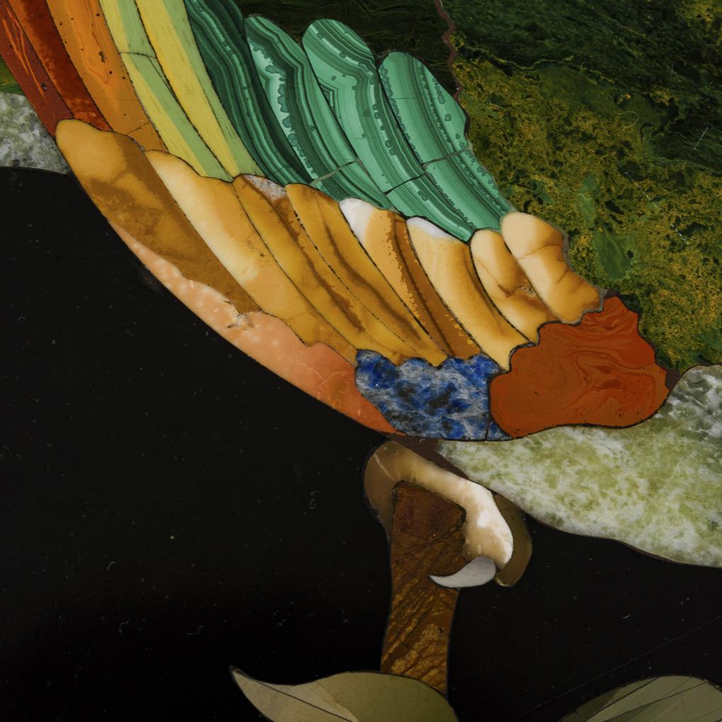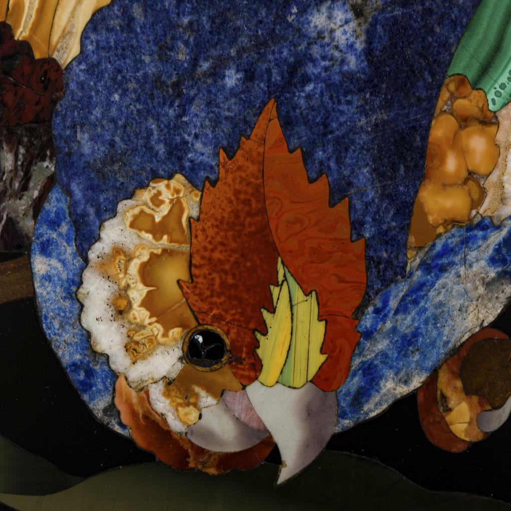 Eiche ebonisiert, unterschiedliche Marmorsorten, Lapislazuli, Malachit und Achat. Ca. 70 x 77 x 57 cm.