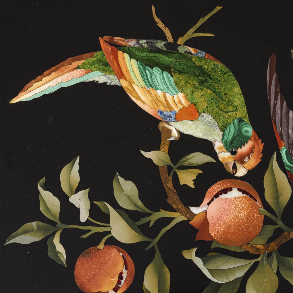 Kleiner rechteckiger Salontisch auf 4 gedrehten Säulen mit üppiger kugelbekrönter Kreuzverstrebung, durchbrochen gearbeitete Zarge mit reliefierten Puttenköpfen, profilgerahmte Deckplatte mit feiner Verzierung aus Papageien und Granatapfelzweig in Pietra Dura-Technik. Leichte Alters-/Gebrauchsspuren.