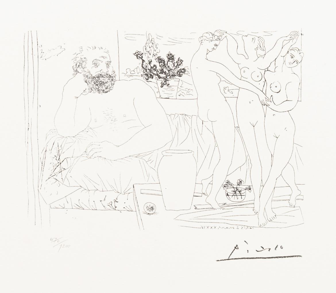 Blatt 5, 81 und 85 aus "Suite Vollard" - Blatt V "Homme dévoilant une femme", Exemplar: 221/1200 | Blatt LXXXI "Sculpteur et Trois Danseuses", Exemplar: 470/1200 | Blatt LXXXV "Scene Bachique au Minotaur", Exemplar: 218/1200.