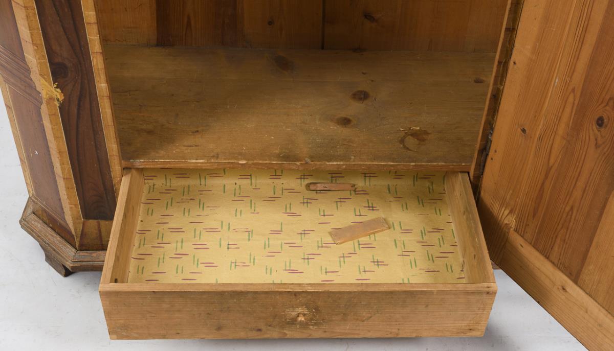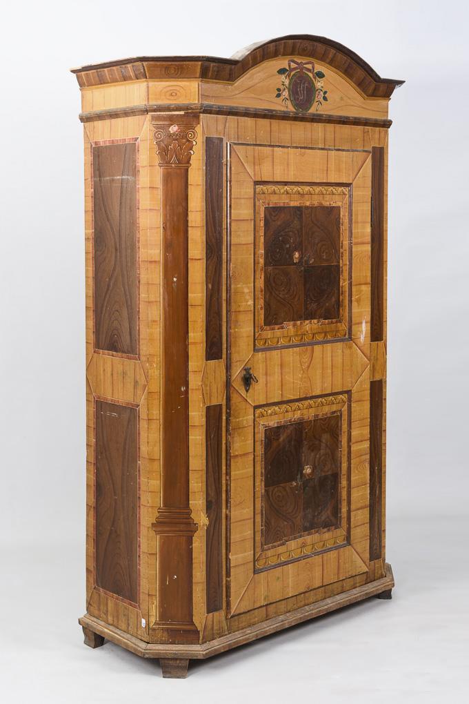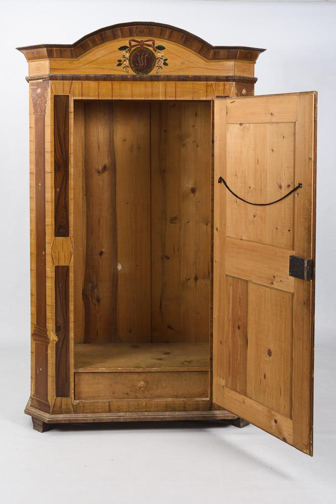 1-türiger Schrank in Brettbauweise, auf originale Fußleiste gesetzt und mit aufgesetztem Bogengiebel, braun maseriert mit Bierlasur, bemalt mit Scheinkassetten und Säulenarchitektur auf den Seitenleisten und Seitenwänden, Giebel mit ligiertem Monogramm "JFP" und Tür mit maserholzlasierten Kassetten; Wappenkartusche als Schlüsselschild; innen Kleiderstange und Hakenstange. 1 versteckter Sockelschub. Alters-/Gebrauchsspuren, inaktiver Anobienbefall, 2 Leistchen fehlen, Bemalung etwas berieben.