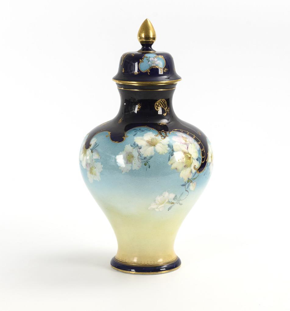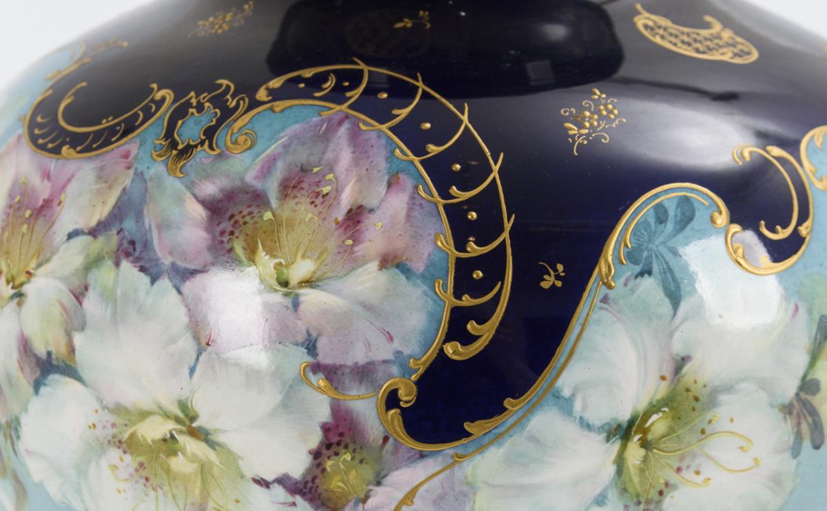 Deckelvase mit kobaltblauem Teilfond und farbiger Blumenmalerei. Wächtersbach.