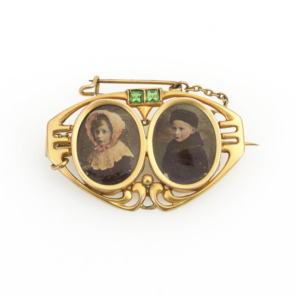 Stiltypische Brosche mit Doppelporträt-Rahmen und 2 grünen Imitationen. Original-Fotos von Kinderpaar. Hakenverschluss und Sicherheitskette mit Nadel.