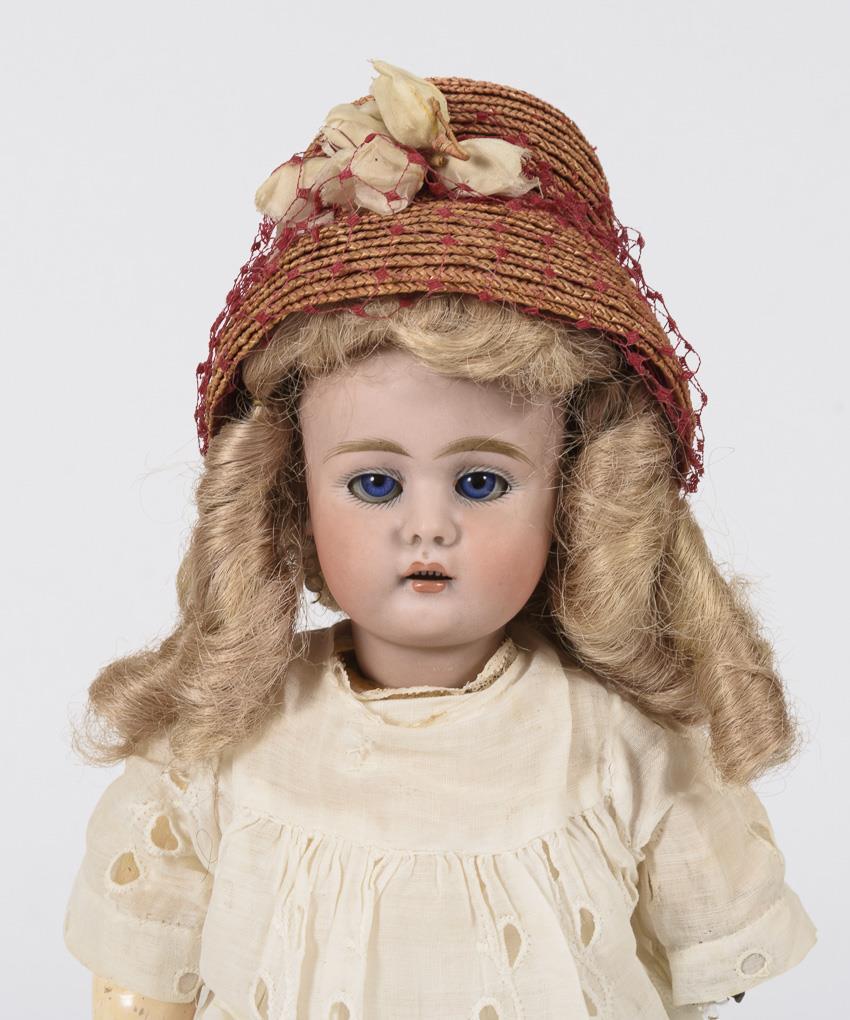 Kurbelkopf, blaue Schlafaugen, Ohrlöcher. 9-teiliger Gliederkörper mit festen Handgelenken. Gelockte Kunsthaarperücke, weißes Kleid, braune Schuhe, Strohhut mit Blumen. Kopf durchleuchtet: ohne Defekte. Körper mit Defekten, Arme geklebt, 2 Finger fehlen.