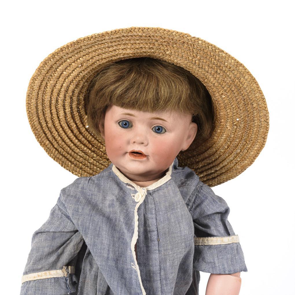 Kurbelkopf, blaue Schlafaugen, brünette Echthaarperücke. 15-teiliger Gliederkörper mit rotem Stempel "Made in Germany". Blauer Anzug, dazu großer Strohhut. Fest vergipster Kopfdeckel: nicht durchleuchtet, jedoch ohne sichtbare Defekte.
