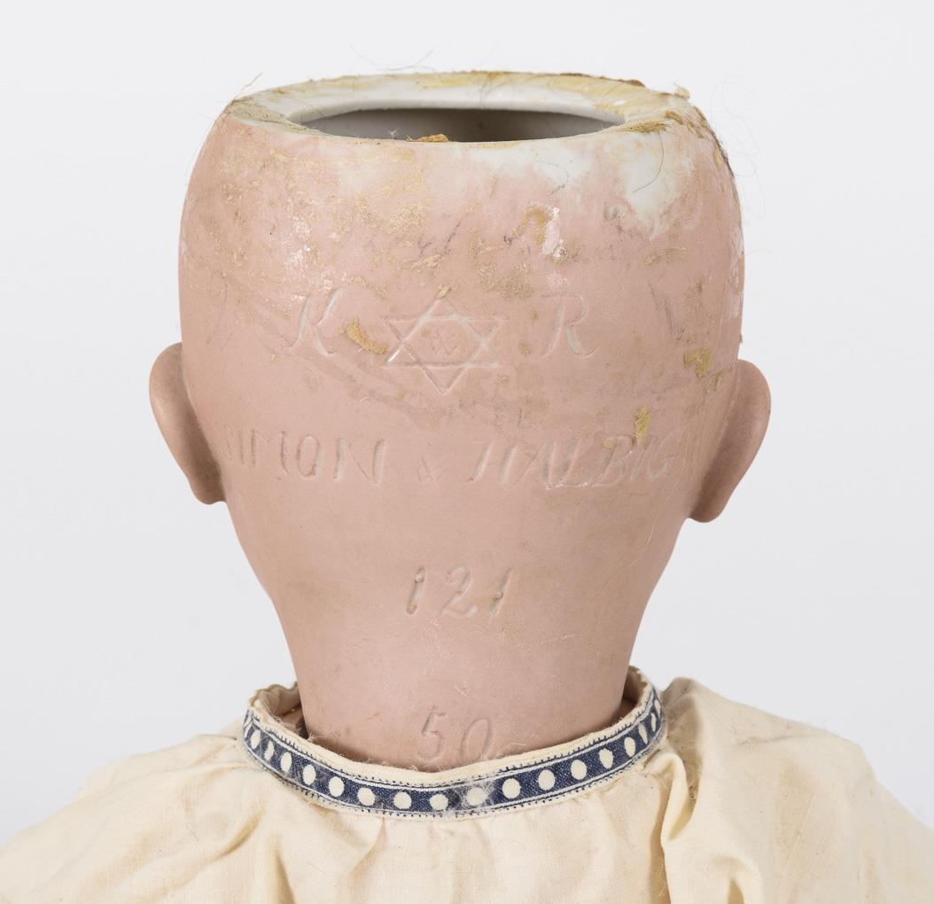 Kurbelkopf, braune Schlafaugen, mittelblonde Echthaarperücke. 5-teiliger Sitzbabykörper. Helles Kittelchen, gestreifte Hose, Haube mit weißem Federflaum, schwarz-weiße Lederschuhe. Kopf durchleuchtet: ohne Defekte. Füße mit kleinen Bestoßungen und Übermalungen.