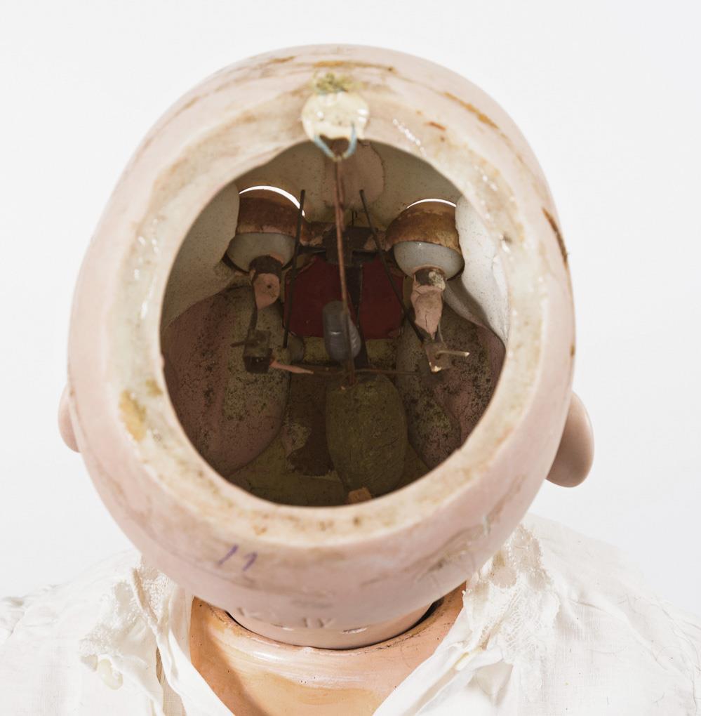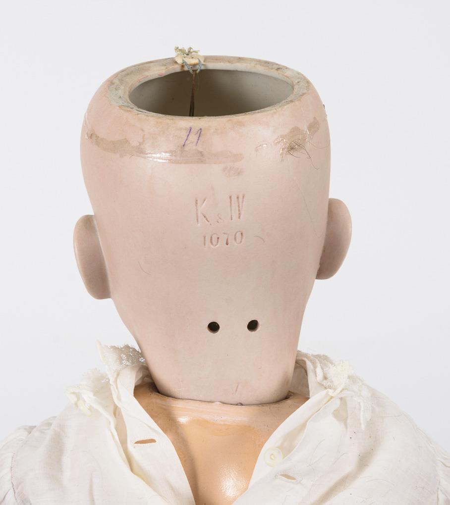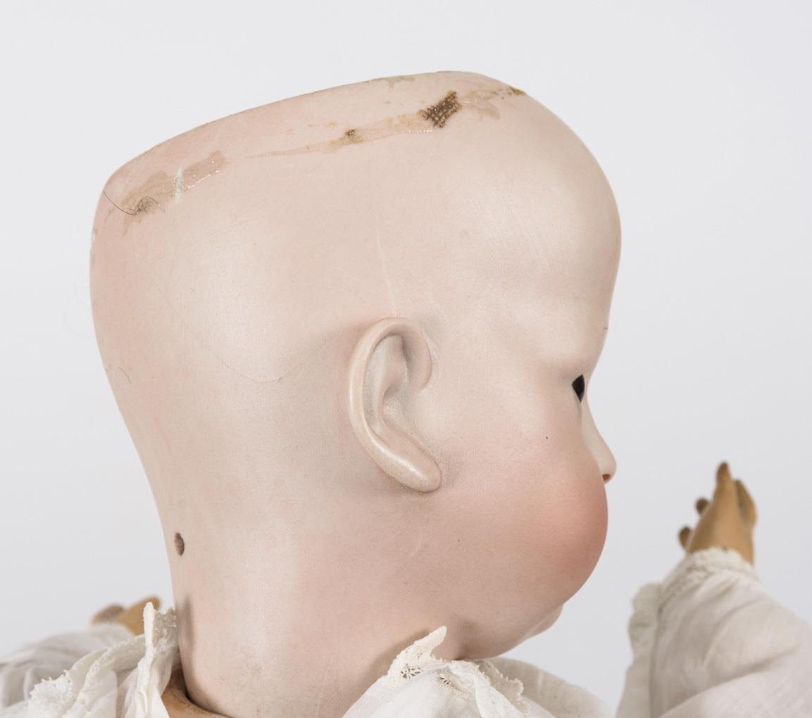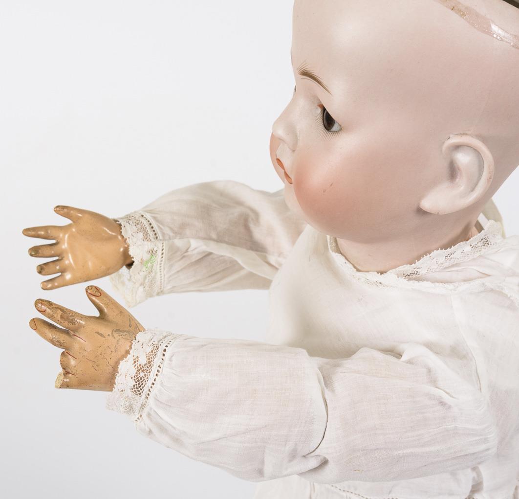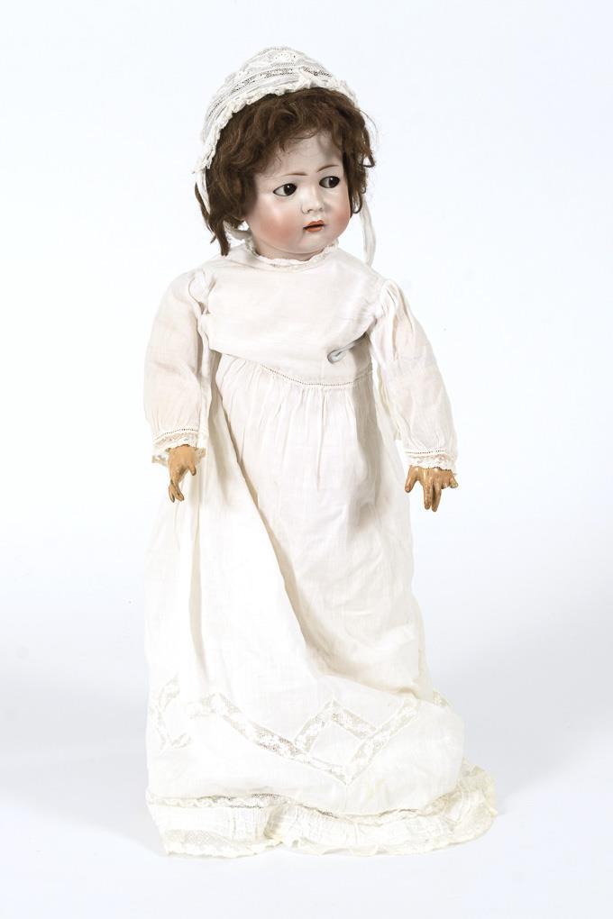 Kurbelkopf, braune Schlaf-/Schelmenaugen, braune Mohairperücke. 15-teiliger Toddlerkörper. Weißes Taufkleid, passende Haube, rote Schuhe. Haarrissig am Hinterkopf, 2 Finger fehlen.