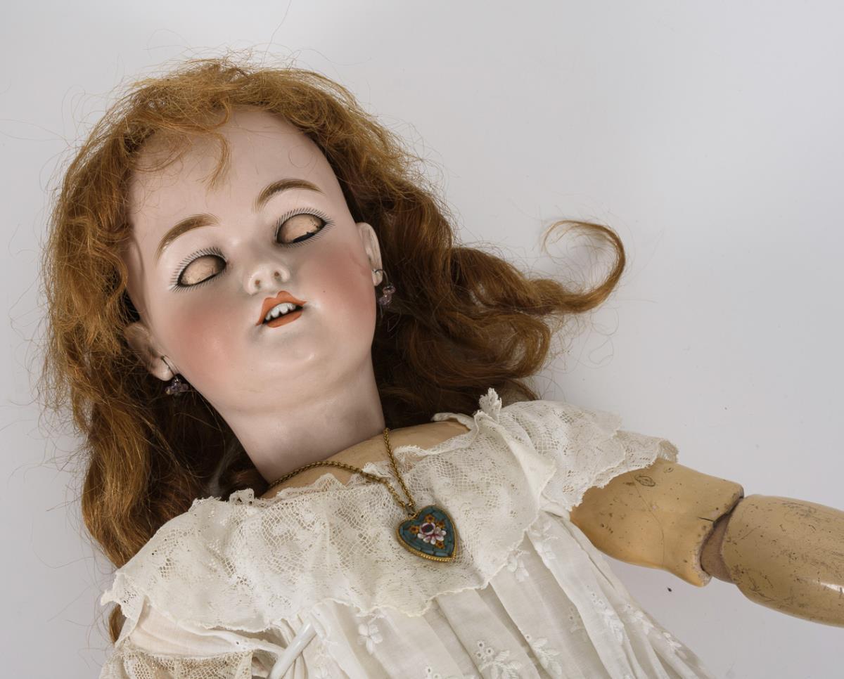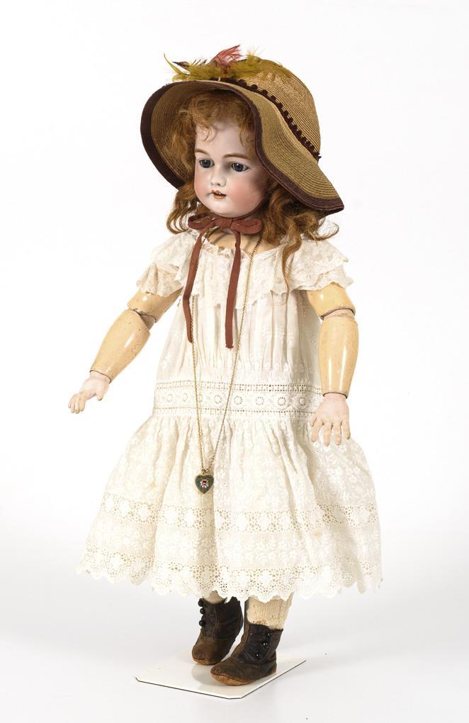 Kurbelkopf, blaue Schlafaugen, Ohrringe, rotbraune Echthaarperücke. 17-teiliger Gliederkörper. Weißes Kleid, Schutenhut aus Stroh, alte braune Lederschuhe. Kopf durchleuchtet: ohne Defekte. Körper mit kleinen Farbdefekten, Hände abgewaschen.