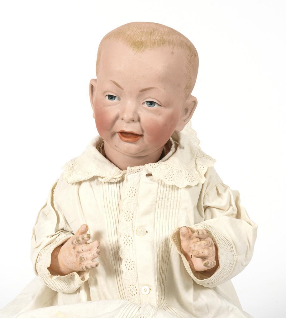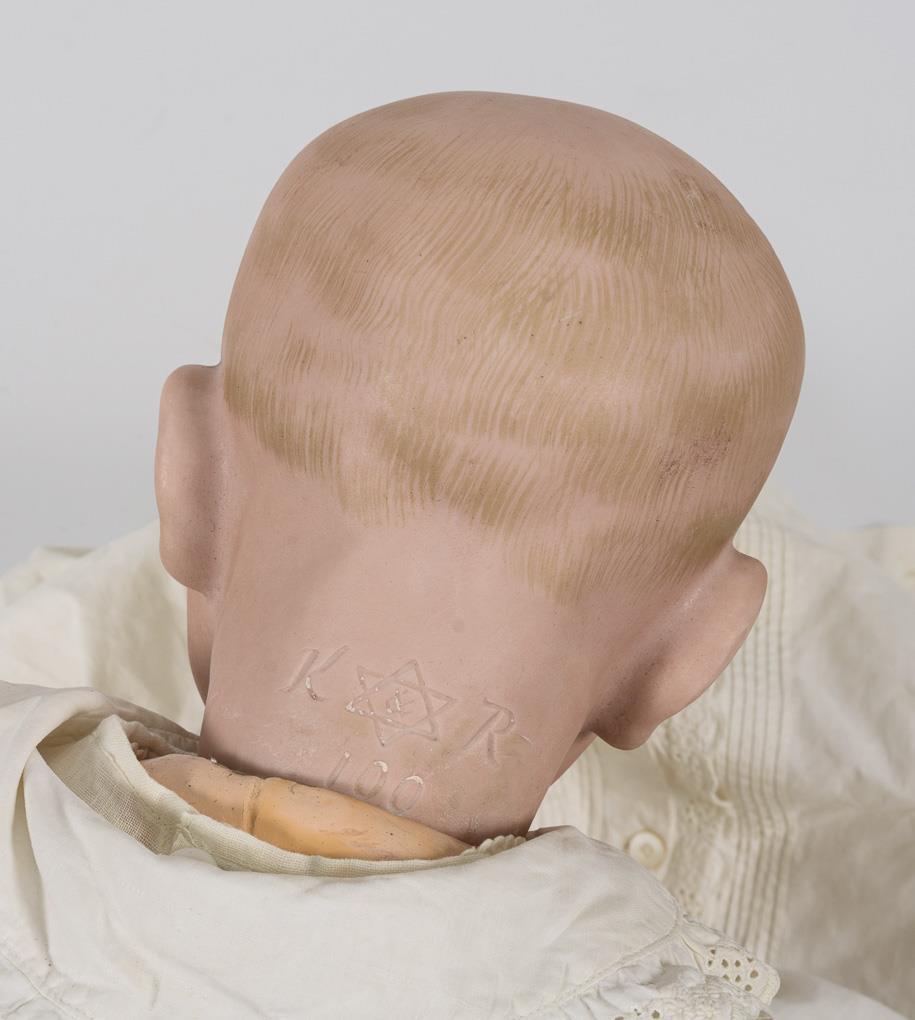 Sogenanntes "Kaiserbaby": Vollkopf, gemalte blaue Augen, offen/geschlossener Mund, gestrichelte Haare. 5-teiliger Sitzbabykörper. Weißes Nachthemd . Kopf ohne sichtbare Defekte, 2 Zehen bestoßen.