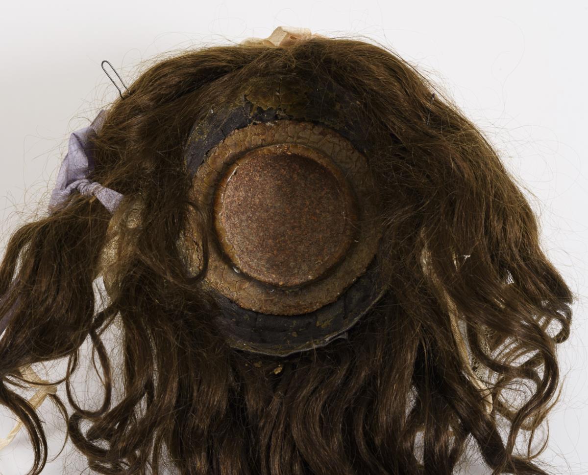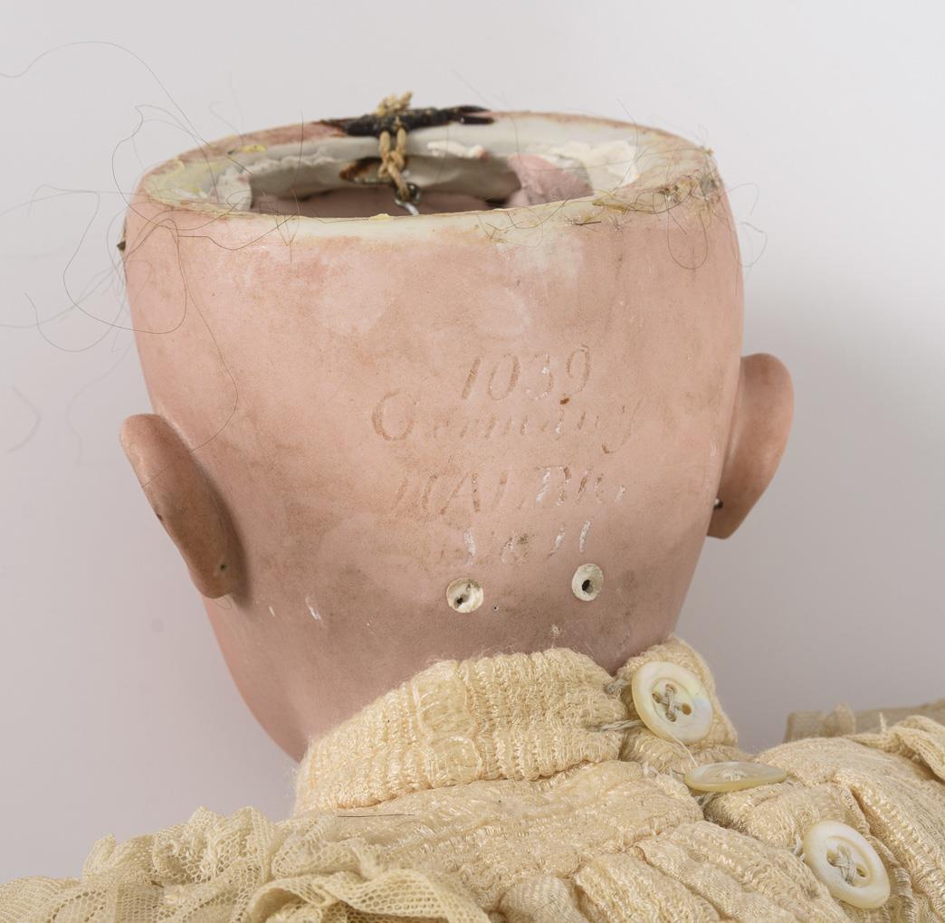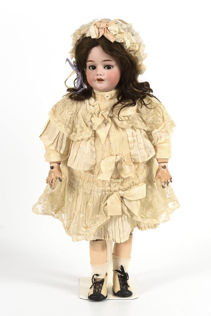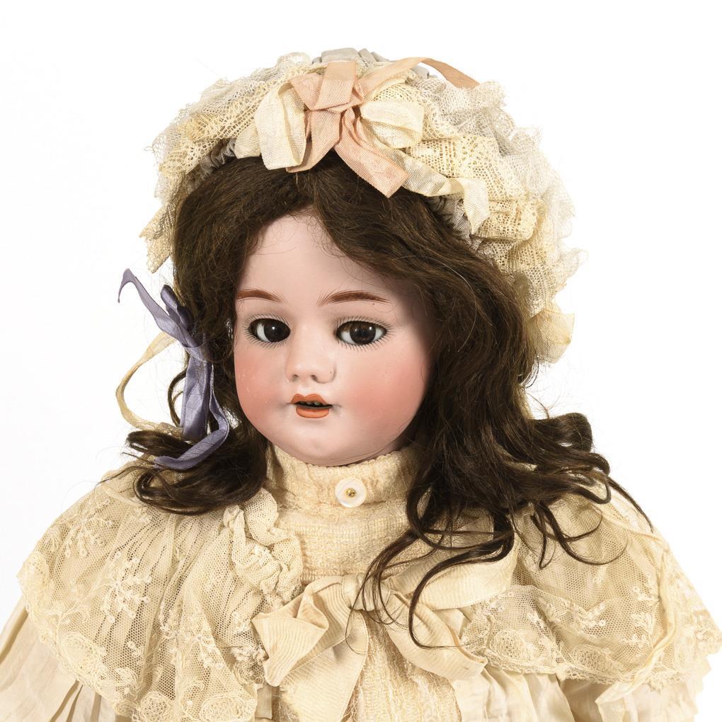 Kurbelkopf, braune Schlaf-/Schelmenaugen mit Echthaarwimpern, braune Mohairperücke. 11-teiliger französischer Gliederkörper mit 2-geteiltem Torso, Laufmechanismus und intakter Stimme, die durch Bewegen der Beine ausgelöst wird. Altes weißes Kleid, alte schwarz-weiße Schuhe, Haube ergänzt. Kopf durchleuchtet: ohne Defekte. Körper mit Farbdefekten (vor allem an den Händen).