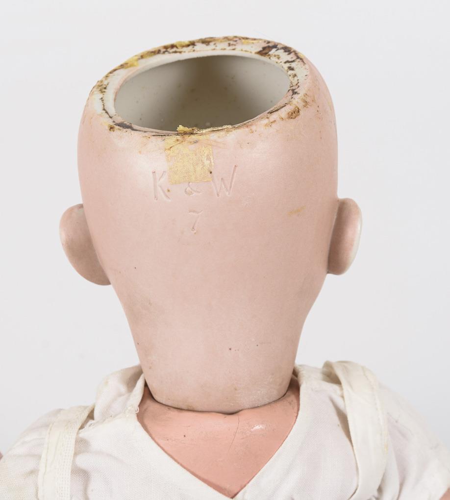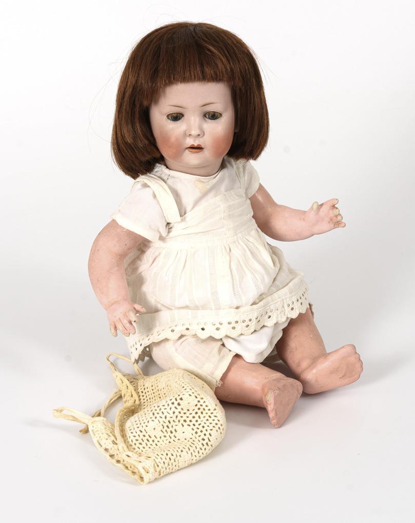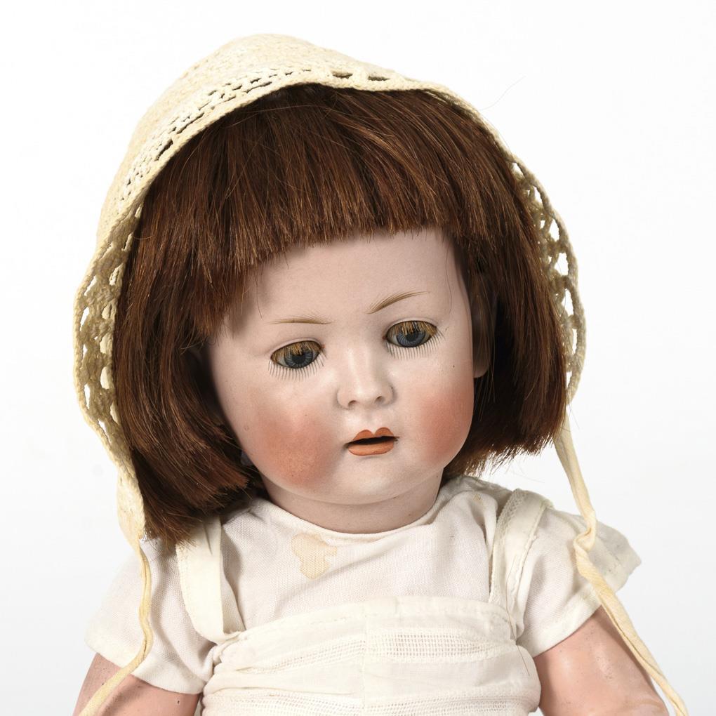 Kurbelkopf, blaue Schlafaugen, blonde Echthaarwimpern, rotbraune Echthaarperücke. 5-teiliger Sitzbabykörper. Weißes Trägerkleid, Häkelhaube. Kopf durchleuchtet: ohne Defekte.