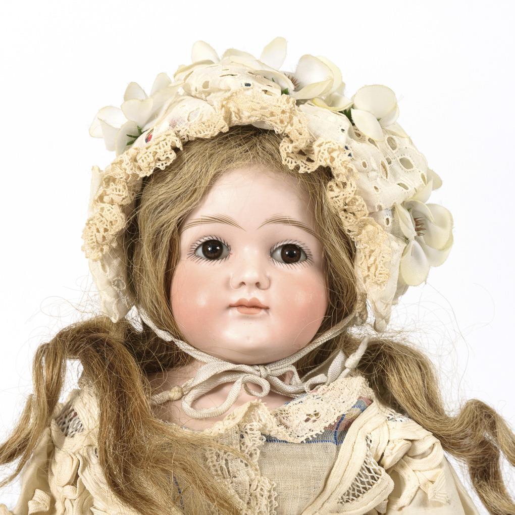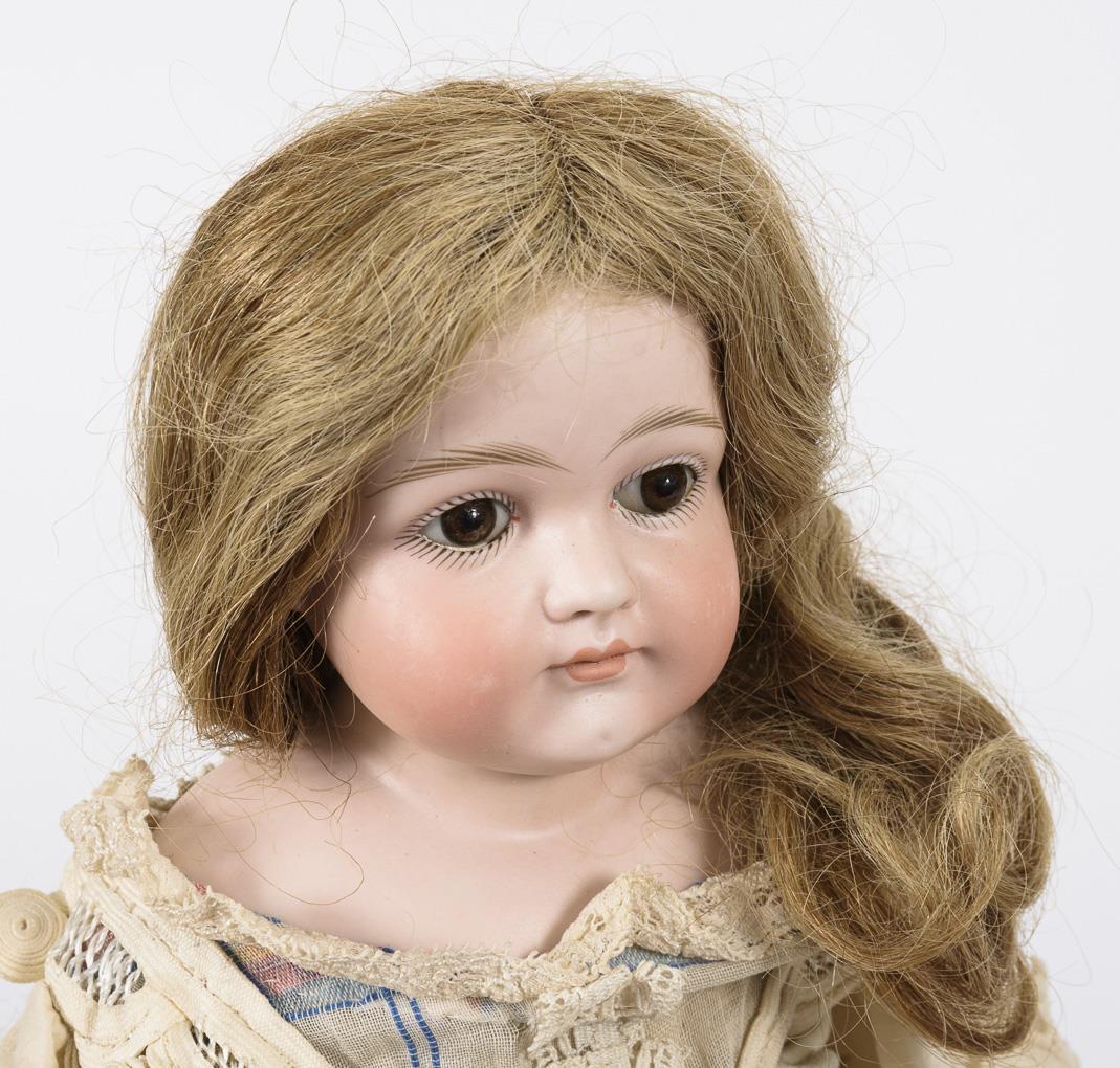 Brustkopf, feste braune Glasaugen, blonde Echthaarperücke. Schlanker Körper aus Stoff und Leder, mit Po- und Kniezwickeln. Kariertes Kleid, Haube mit Blumenschmuck, schwarze Schuhe. Haarriss am Schulterblatt hinten, Iris beider Augen restauriert, Arme und Beine mit Reparaturen, Unterarme ergänzt.