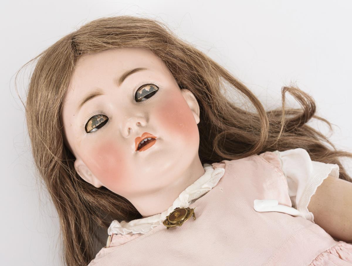 Kurbelkopf, braune Schlaf-/Schelmenaugen mit Metalllidern, lange Echthaarperücke. 15-teiliger Gliederkörper mit 2-geteiltem Torso und intakter Stimme. Rosa Kleid, braune Lederschuhe. Kopf durchleuchtet: ohne Defekte. Augenlider berieben, 2 Finger links fehlen, Farbdefekte rund um die Halspfanne am Körper.
