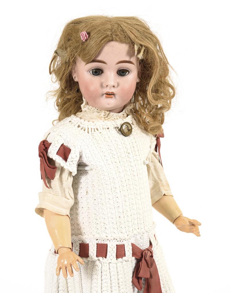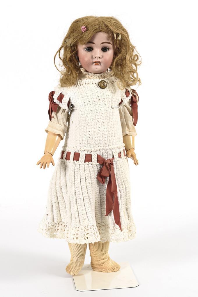 Kurbelkopf, blaue Schlafaugen, Ohrringe, blonde Echthaarperücke. 13-teiliger Gliederkörper. Weißes Häkelkleid mit roten Schleifen. Kleiner Chip an der linken Schläfe, Produktionsfehler am Hinterkopf, Augenlider übermalt, 1 Fuß repariert.