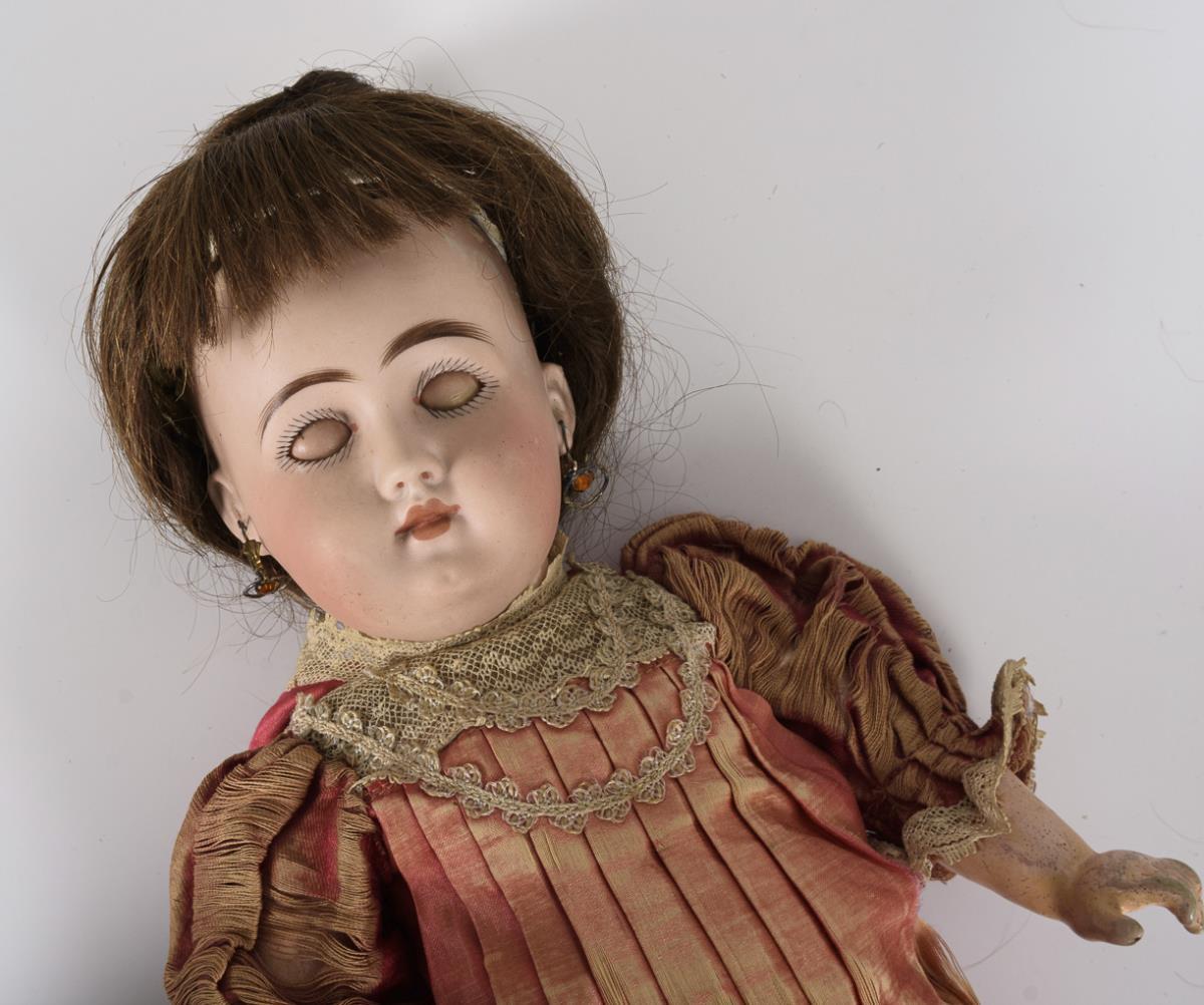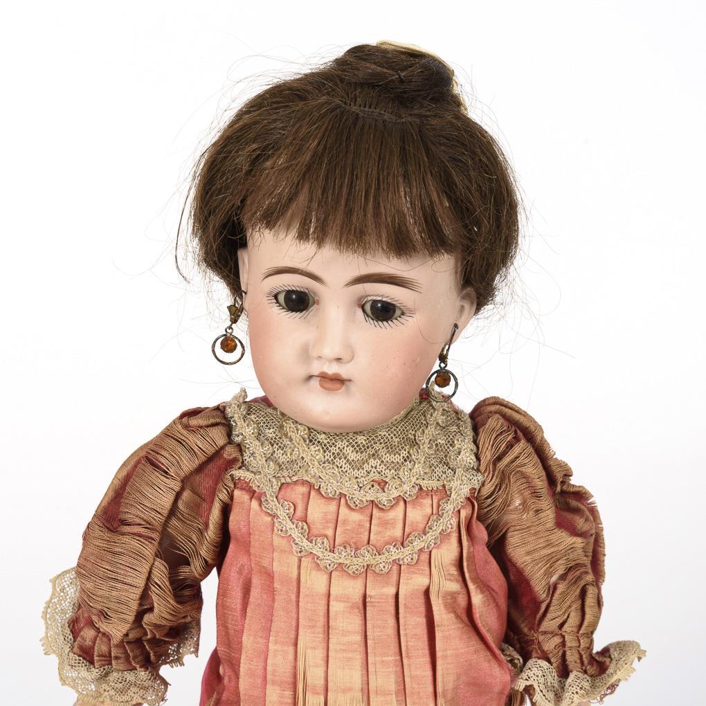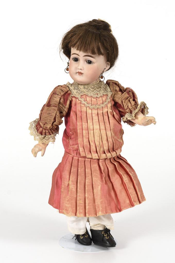 Kurbelkopf, braune Schlafaugen, Ohrlöcher, dunkelbraune Echthaarperücke. 9-teiliger Gliederkörper. Originales hellrotes, plissiertes Seidenkleid, alte Ohrringe, schwarze Schuhe. Am rechten Auge und an den Ohrlöchern je 1 winziger Chip. Körper mit retuschierten Reparaturstellen.