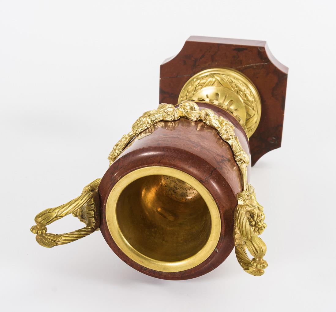Schlanke Marmorvasen mit verziertem Bronzefuß und Blütengirlanden zwischen den Fauns-Maskarone sowie kleine Messing-Einsätze. Geringe Chips an der Plinthe, Girlanden nachbronziert.