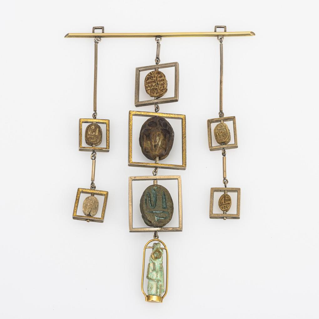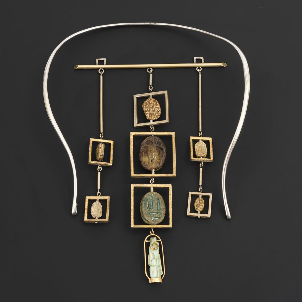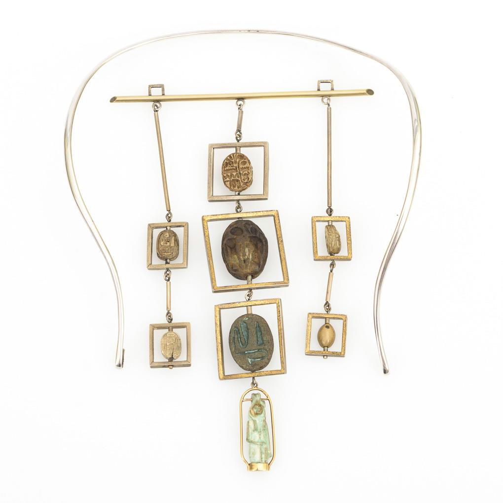 Außergewöhnlicher, großer Anhänger mit antiken Skarabäen und kleiner Plastik, an Halsreif.
